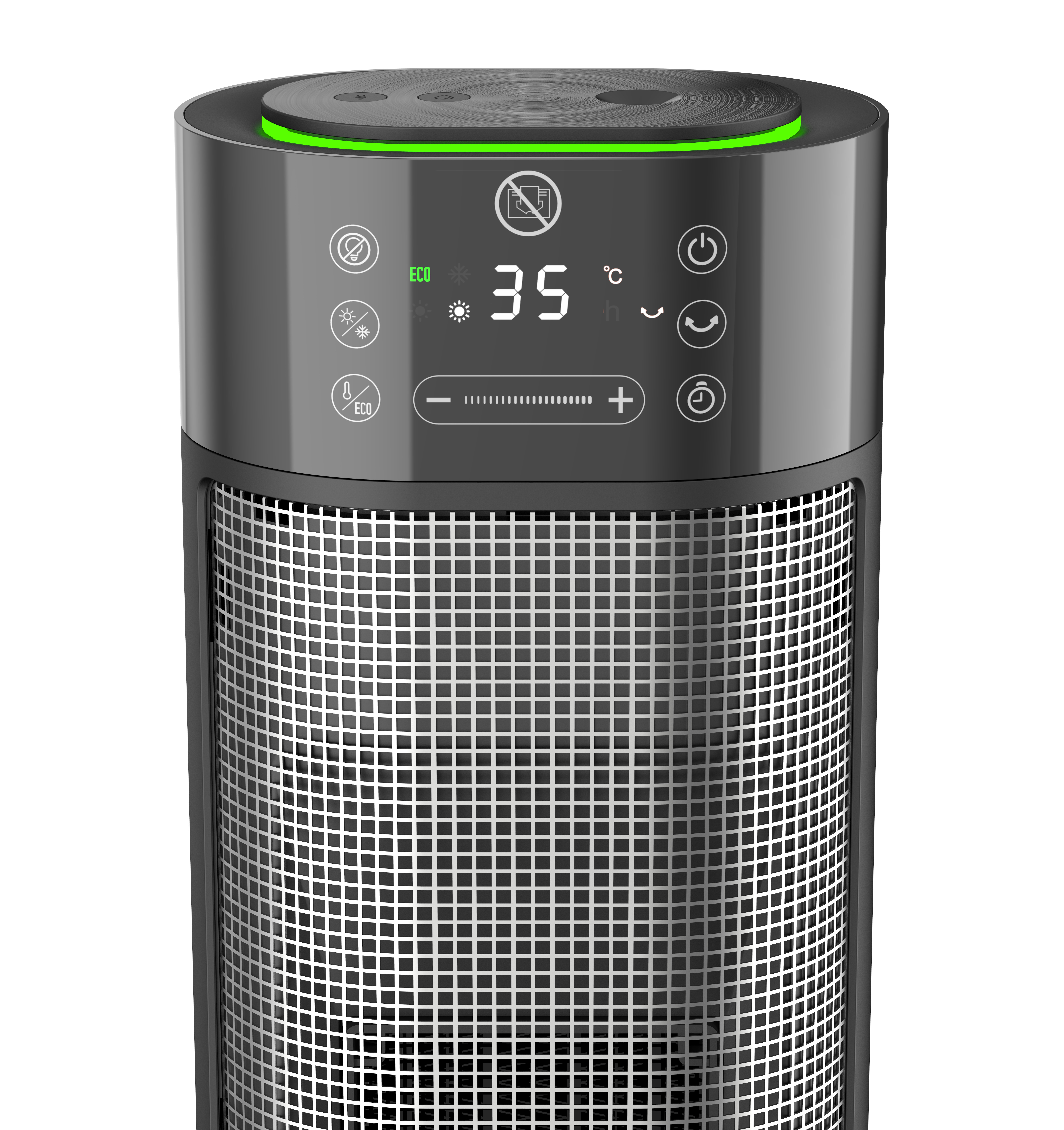 Dankzij de PTC-keramische verwarmingstechnologie levert de Tower Humy een nominaal verwarmingsvermogen van 2000 W, met een minimaal vermogen van 1300 W voor energiezuinig gebruik. Je kunt kiezen uit drie verwarmingsmodi: