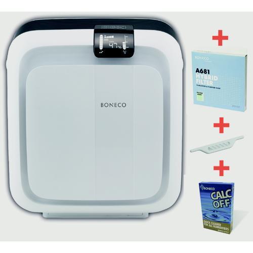 De hybride Boneco H680 reinigt en bevochtigt gelijktijdig de binnenlucht. De intelligente besturing zorgt voor een nagenoeg geruisloze werking zodat de Boneco H680 zelfs in de slaapkamer of babykamer kan worden gebruikt. De Boneco H680 werkt volautomatisch, maar u kunt ook desgewenst de instellingen aan uw wensen en voorkeuren aanpassen. Verlichting bij allergieën De BONECO H680 is uitgerust met een drievoudig filtersysteem dat niet alleen onaangename geurtjes, maar ook stof, pollen en vuildeeltjes uit de lucht haalt. Dankzij het HYBRIDE-filter worden talrijke allergische klachten effectief verlicht – zoals hooikoorts of allergische reacties op uitwerpselen van de huisstofmijt. Droge lucht Een goede luchtvochtigheid is van groot belang voor onze gezondheid. Droge binnenlucht leidt tot een schilferende en jeukende huid. Ogen en keel voelen droog aan, het welbevinden neemt duidelijk af. Dat geldt niet alleen voor volwassenen, maar zeker ook voor baby's, peuters en zelfs huisdieren. Droge slijmvliezen maken ons in de winter ook vatbaarder voor verkoudheden en andere infecties. Met de Boneco H680 behoren deze problemen tot het verleden. Zijn intelligente besturing houdt de lucht schoon en de luchtvochtigheid steeds op het ideale niveau – zelfs in grote ruimten met een oppervlak tot 100 vierkante meter. Keuze uit verschillende modi In alle drie bedrijfsstanden “Hybride”, “Luchtreiniging” en “Luchtbevochtiging” kunnen drie verschillende modi worden gekozen: MODUS “AUTO”: In deze modus gebruikt de BONECO H680 alle ventilatorstanden tussen 1 en 6. De vooringestelde luchtvochtigheid bedraagt 50%. MODUS “SLEEP”: In deze modus kan de BONECO H680 ook 's nachts in de slaapkamer worden gebruikt. Het apparaat werkt volautomatisch in de laagste ventilatorstand 1 om het geluid tot een minimum te beperken. De vooringestelde luchtvochtigheid bedraagt 45%. MODUS “BABY”: In deze modus gebruikt het apparaat de ventilatorstanden 1 t/m 4 en verhoogt het de luchtvochtigheid tot 60%. Deze waarde is ideaal voor de babykamer, voor baby's en peuters wordt een hogere luchtvochtigheid aanbevolen. De ventilator draait bovendien zo zachtjes dat een babyfoon niet op het apparaat reageert.