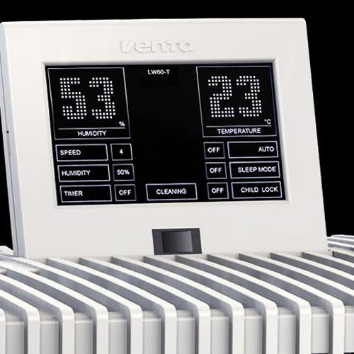 Venta LW60T luchtbevochtiger en airwasher voor grote ruimtes. De Venta LW60T is van een absolute premium kwaliteit. Dankzij de koude verdamping blijft er in ruimten tot 150 m² uitsluitend schone lucht achter. De lucht wordt betrouwbaar en snel ontdaan van pollen, huisstof, haren van huisdieren, bacteriën en geurtjes. Luchtbevochtiger Venta Airwasher LW60T produceert zelf geen bacteriën en er ontstaat geen kalkneerslag. De LW60T zorgt er ook voor dat een te hoge vochtigheid in de ruimte wordt voorkomen. Net zo overtuigend zijn het extreem hoge vermogen door de grote stapel lamellen, het eenvoudig uitneembare waterreservoir en vooral de wereldwijd gepatenteerde Venta Hygiënedisk. Deze zorgt voor een betrouwbare ontharding van het water door ionenwisseling en weet te overtuigen door het bijzonder hygiënische gebruik dankzij het zilver gedoteerd 'ionenwisselaargranulaat'. Tel hierbij nog het eenvoudige onderhoud en de lange gebruiksduur van ca. drie maanden per disk. Hierdoor is deze premium Airwasher nog eenvoudiger in bediening en onderhoud dan ooit tevoren. Het nieuwe, interactieve touch display, de geruisloze werking en het lage energieverbruik completeren het overtuigende profiel van de Venta LW60T luchtbevochtiger. Geen twijfel meer: het is nu tijd om stevig door te ademen. Geniet van hygiëne van een absoluut topniveau! Hygiëne op het allerhoogste niveau Airwasher voor grotere ruimtes in premium kwaliteit Innovatieve wereldwijd gepatenteerde Hygiëne-Disk voor waterontharding Eenvoudig uitneembaar waterreservoir Zeer laag stroomverbruik Fluisterstil Onderhoudsvriendelijke luchtbevochtiger Met interactief touchscreen en afstandsbediening
