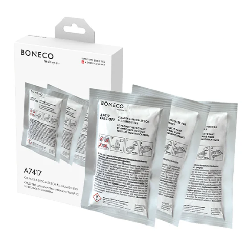 Boneco A7417 CalcOff Reinigings- en ontkalkingsmiddel voor luchtbevochtigers, luchtwassers en andere huishoudelijke apparaten De samenstelling van het reinigings- en ontkalkingsmiddel van Boneco is speciaal afgestemd op de behoefte van reiniging- en ontkalking van luchtbevochtigers en andere huishoudelijke apparaten. CalcOff biedt ideale bescherming tegen kalkaanslag en verwijdert deze veilig zodat uw luchtbevochtiger optimaal werkt. Gebruik De werkwijze is heel eenvoudig: Meng de inhoud van een sachet (poeder) met 1 liter heet water en giet in het waterreservoir. Laat 60 minuten intrekken. Gebruik CalcOff, het reinigings- en ontkalkingsmiddel voor alle luchtbevochtigers, één keer per maand! Kenmerken Eenvoudig in gebruik (meng de inhoud van één sachet met 1 liter heet water) Milieuvriendelijk (poedervorm, vlak voor gebruik vermengd met water) 3-pack: 1 pack is genoeg voor drie keer gebruiken Ontkalk de waterbak en tank elke 2-3 weken Toepassing Voor alle luchtbevochtigers en ook voor andere huishoudelijke apparaten Inhoud Boneco A7417 CalcOff-verpakking bevat 3 sachets