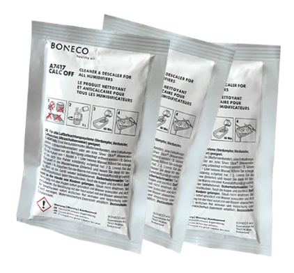 Boneco A7417 Calc-off is een reinigings- en ontkalkingsmiddel in poedervorm. Geschikt voor het verwijderen van kalkaanslag in luchtbevochtigers van Boneco en Air-o-Swiss. Door het gebruik van kalkhoudend water in een luchtbevochtiger, vindt afzetting van kalk op oppervlakten plaats. Deze kalk zal na 2 tot 3 maanden - afhankelijk van de intensiteit van gebruik en hardheid water - moeten worden verwijderd om schade aan de luchtbevochtiger te voorkomen. Let op, elk doosje Calc-off bevat 3 zakjes anti-kalk poeder en is dus 3 keer te gebruiken.