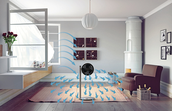 BONECO F235 ventilator combineert techniek en design De Boneco F235 is een veelzijdig inzetbare, in hoogte verstelbare ventilator. Dankzij de speciale verbindingsstructuur van de voet kan de hoogte van de ventilator individueel worden ingesteld op 49, 85 of 121 cm (maximaal twee verbindingsstukken gelijktijdig te gebruiken). De ventilator is uitgerust met een verstelbare kop met een kantelhoek tot 270 graden en kan volledig naar wens worden gericht. De uitstekende luchtcirculatie wordt bereikt door drie hoofdelementen: Het eenarmige ontwerp zorgt voor maximale luchtinlaat De diepe ventilatorbladen verplaatsen grote hoeveelheden lucht De speciale boogvorm van het frontrooster verhoogt de luchtsnelheid Door de luchtstroom richting het plafond te richten, ontstaat het typische Air Shower-effect en worden warme en koude zones verminderd. Het is mogelijk om lucht tussen meerdere verdiepingen te verdelen, frisse lucht naar buiten af te voeren of in combinatie met airconditioning of verwarming een gelijkmatige temperatuur te creëren. Het bovenste gedeelte van de F235 DC bevat de vermogensregelaar met 32 snelheidsstanden. Stand 1 tot 16 zijn bedoeld voor directe koeling en 17 tot 32 voor indirecte koeling. In de voet bevindt zich een digitaal display waarop de actuele ventilatorsnelheid wordt weergegeven. Via de BONECO App kunnen de timerfunctie en de dimstanden van het display naar wens worden aangepast. Kenmerken Standventilator Luchtcirculatie: 1.439 m³/u Kantelbare kop: 270° handmatig draaibare luchtstroom 32 ventilatorsnelheden. 16 direct en 16 indirect Digitaal display in de voet In hoogte verstelbaar: 49, 85 of 121 cm Bedienbaar via Bluetooth met de BONECO App Geluidsniveau: 34 – 64 dB(A) Bekroond met de Red Dot Design Award
