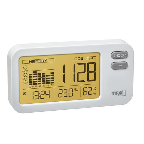 CO2 meter TFA AirCO2ntrol Coach helpt u te controleren hoe oud en vervuild de lucht is in binnenruimtes waar veel mensen aanwezig zijn, zoals in scholen, kantoren en openbare gebouwen. Tijdig en goed ventileren zorgt voor een gezond binnenklimaat. CO2 meter TFA AirCO2ntrol Coach toont op het display de actuele CO2 waarde van de binnenlucht, de temperatuur, luchtvochtigheid en de tijd. De verlichtingskleur van het display van de CO2 sensor kan worden gebruikt om de huidige CO2-metingen snel te evalueren en te interpreteren. Afhankelijk van de instelling signaleert de verlichting direct de actuele luchtkwaliteit in de verkeerslichtkleuren groen, oranje, rood. Wanneer een bepaalde limiet wordt overschreden kan de rode displayverlichting als optisch signaal functioneren. U kunt voor het display ook uit zeven tinten een effen kleur kiezen of de verlichting volledig uitschakelen. De drie Smiley pictogrammen dienen als comfortzone-indicator voor de gemeten waarden van de afgelopen 24 uur. Als de aflezing op het niveau van de happy Smiley ligt, is de luchtkwaliteit ideaal tot goed. De grafiek op het display van de CO2 sensor laat duidelijk de ontwikkeling van de CO2-niveaus van de afgelopen 24 uur zien. De stroom wordt geleverd via USB-voeding (pc, laptop). CO2 Meter TFA AirCO2ntrol Coach, de kenmerken Kooldioxide CO2 monitor. Hygrometer. Thermometer. Max-Min functie. CO2-niveaumeting met stoplichtindicator. Geschikt voor vrije opstelling en voor wandmontage Stroomvoorziening via USB-kabel. Wie goede lucht inademt, is gezonder, gelukkiger en kan meer. Hoofdpijn, duizeligheid en blijvende vermoeidheid zijn vaak te wijten aan een hoge concentratie CO2 in de lucht.