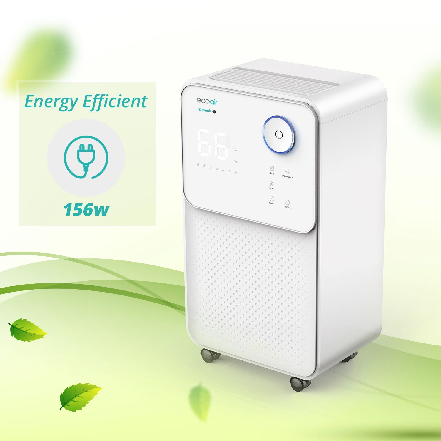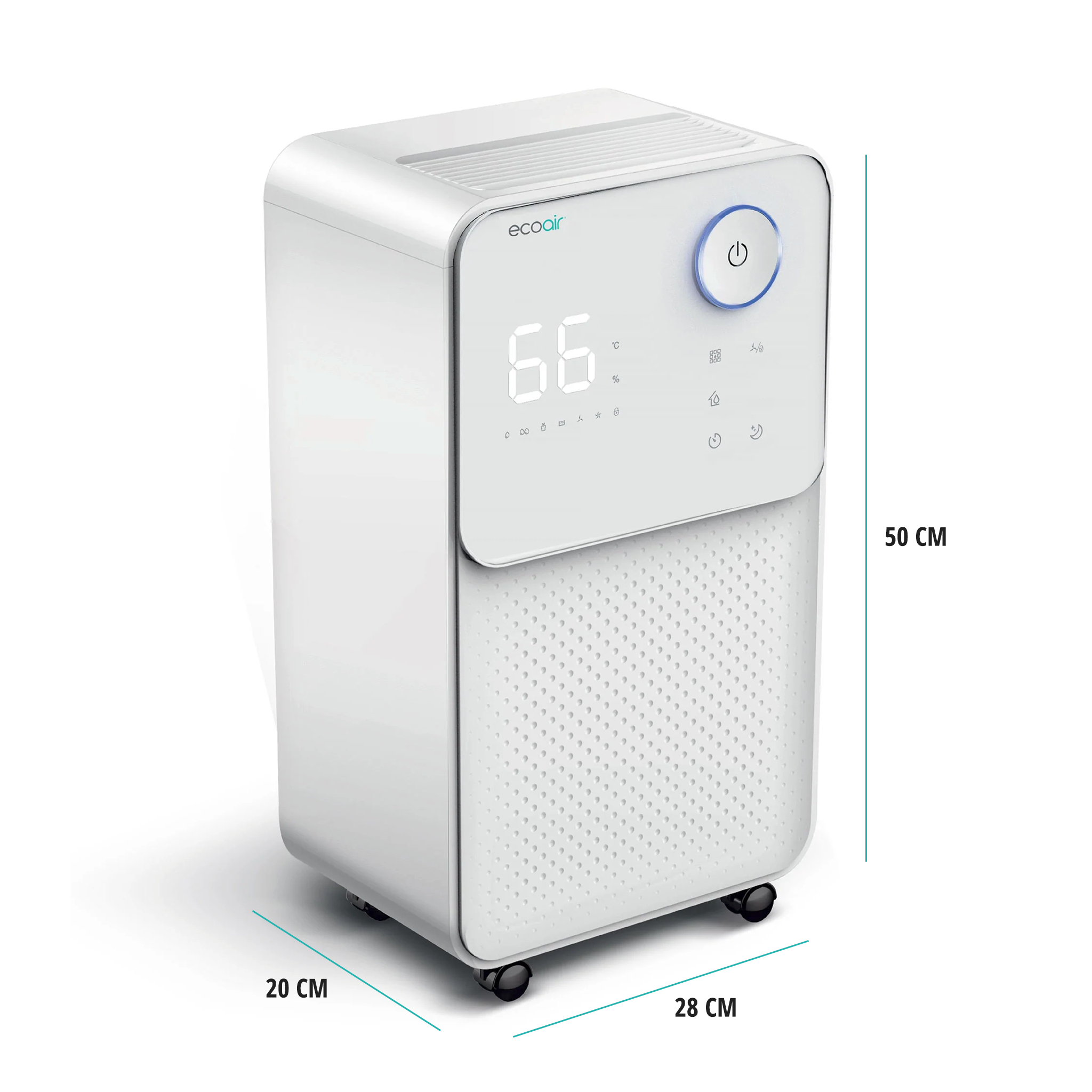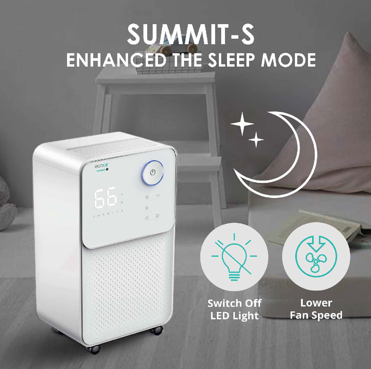 EcoAir Summit-S is een mooi ontworpen luchtontvochtiger met een energiezuinige werking. Hij geeft duidelijk de luchtvochtigheid aan op zijn grote display. Summit-S kan tot 12 liter water per dag verwijderen. Dankzij het 3-laags koolstoffilter, PET-filter (Polyethyleentereftalaat) en stoffilter, kan deze kleine ontvochtiger de lucht ook reinigen. De combinatie van ontvochtiger en luchtreiniger is ideaal voor het verkrijgen van een aangenaam binnenmilieu. Geen last meer van vocht en vervelende geuren.