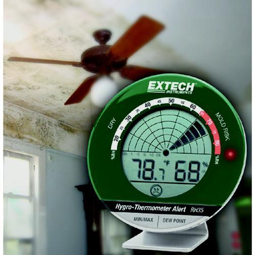 De Extech RH35 hygrometer en temperatuurmeter is een binnenklimaatmeter met een grafisch display. De vochtmeter meet de relatieve vochtigheid en temperatuur in een ruimte. Met weergave van smileys voor indicatie van het comfort en voor een ongewenste vochtigheidsgraad.