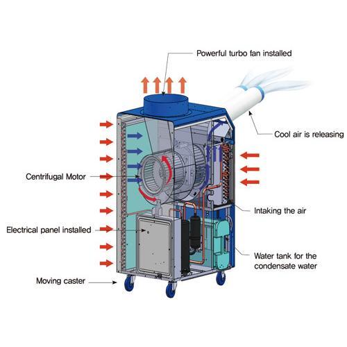 Industriële mobiele airco Weltem SC60000 voor professioneel koelen op de juiste plek en direct klaar voor gebruik. Het spot airco systeem Weltem SC60000 levert professionele koeling precies op de plek daar waar u het nodig heeft, zowel binnen als buiten. De industriële cooler bezit een koelcapaciteit van 17,6 kW, is verrijdbaar, werkt stand-alone en is een multifunctioneel airconditioningsysteem dat warmte en een hoge luchtvochtigheid tegen gaat. Professionele spot airco Weltem SC60000 heeft een ingebouwde condenspomp voor het afvoeren van condenswater.