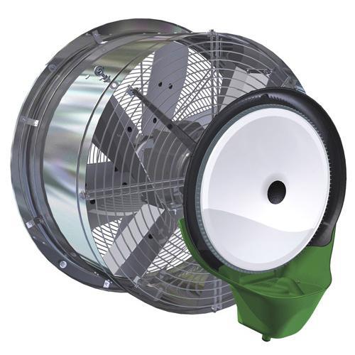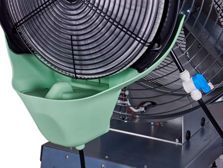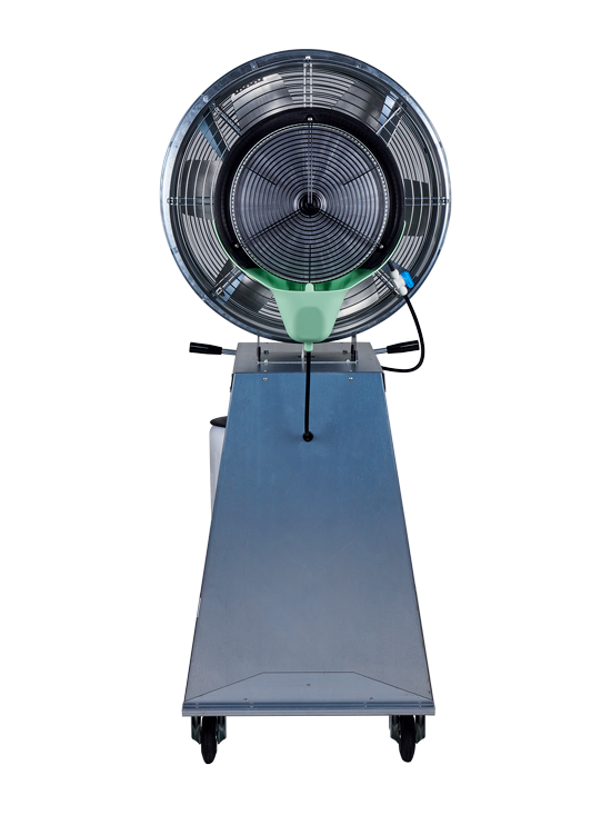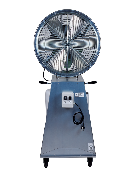 Mobiele luchtbevochtiger Franco UF26 brengt door verneveling van water tevens verkoeling (Adiabatische koeling). Industriële luchtbevochtiger Franco UF26 geeft een hoge luchtverplaatsing om een grote oppervlakte te bevochtigen of te koelen.