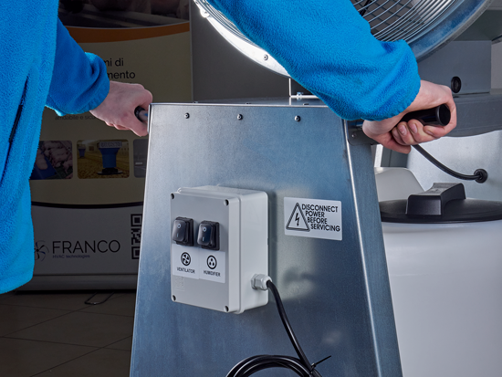 • Franco UF26 is een mobiele centrifugaal verstuiver met een ventilator, aangedreven door twee motoren, dit maakt hem flexibel instelbaar en geschikt voor grote ruimtes.