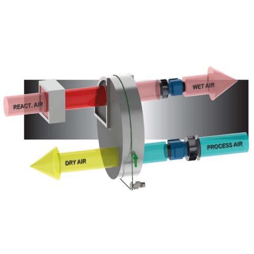 Luchtontvochtiger Fral FR850 bezit een rotorwiel met een hoge capaciteit en is ontworpen voor de grotere en meer uitdagende toepassingen dan de kleinere FR modellen. Het speciale ontwerp biedt zeer gemakkelijke toegang tot alle componenten voor service en installatie. Luchtontvochtigers uit de Fral FR-serie kunnen zelfs onder extreme omstandigheden van -20 °C tot + 40 °C een perfect ontvochtigingsproces garanderen en dauwpunten tot -60 °C bereiken, waardoor een continue en gecontroleerde luchtbehandeling wordt gegarandeerd. De technologie van adsorptie luchtontvochtiging is gebaseerd op het gebruik van natuurlijk voorkomende droogmiddelen zoals silicagel. Deze wijze van drogen maakt de Fral FR850 adsorptie luchtdroger geschikt voor gebruik in omgevingen waar constante luchtvochtigheidswaarden zijn vereist. Fral heeft de FR-ontvochtigers ontwikkeld om aan alle behoeften van ontvochtiging te kunnen voldoen, bij een breed scala aan omstandigheden. In deze Fral FR luchtdroger kunnen zeer efficiënte oplossingen voor energieterugwinning worden geïntegreerd. Werkingsprincipe De adsorptie luchtontvochtiger werkt met twee luchtstromen: de hoofdluchtstroom, de PROCESLUCHT die wordt gedroogd en een tweede, kleinere luchtstroom voor het regenereren van het rotormateriaal. Zijn twee, zeer efficiënte motoren met ventilatoren, creëren de afzonderlijke luchtstromen in tegengestelde richting. De PROCESLUCHT wordt door de ontvochtigingsrotor gevoerd, waarbij vocht door het droogmiddel op de rotor wordt opgenomen. Als droogmiddel wordt silicagel gebruikt, dit hygroscopische materiaal kan vele malen zijn gewicht in vocht vasthouden, maar altijd als een damp en zonder vrij water. Terwijl de proceslucht de rotor passeert, wordt het vocht in de lucht geabsorbeerd door de silicagel. De droge luchtstroom wordt uit de luchtdroger gevoerd voor verdere verwerking, of direct naar de te conditioneren ruimte. PLC-bediening Alle standaard Fral adsorptiedrogers zijn voorzien van PLC-besturing. De PLC-besturing regelt volgende functies: regeneratie temperatuurregeling, thermische beveiliging, regeneratie afkoeltijd, startvolgorde van componenten, alarm reset, relatieve luchtvochtigheid of dauwpunt regeling (afhankelijk van regeling vereist) en regeling van voor- en nakoeling of verwarming. Het display van de gebruikersinterface kan op afstand worden bediend. De PLC-besturing is ingesteld voor externe vochtregeling en accepteert analoge signalen van vochtsensoren. Industriële Adsorptie Luchtdroger Fral FR850 Ontvochtingscapaciteit: 4.8 kg/uur (20°C/60%) Luchtvolume: 850 m³/uur Statische druk: 200 Pa Regeneratielucht volume: 250 m³/uur Regeneratie statische druk: 180 Pa Type: Elektrisch / Stoom Voeding: 400 Volt / 3 Ph / 50 ± 5% Hz Maximaal opgenomen vermogen: 7.0 kW Maximaal opgenomen vermogen: 11.2 Ampère Afmetingen: L 1.000 x B 600 x H 1.000 mm Gewicht (leeg): 145 kg Proceslucht inlaat: Ø 250 mm Droge lucht uitlaat: Ø 200 mm Regeneratielucht inlaat: Ø 160 mm Vochtige lucht uitlaat: Ø 160 mm