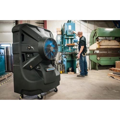 Luchtkoeler Portacool Jetstream 240 geeft koeling waar het nodig is. Geen vaste installatie, geen luchtslangen, direct koelen nadat hij met water gevuld is. Portacool Jetstream 240 is een mobiele aircooler voor bedrijven, loodsen, sportfaciliteiten en buitenruimtes en is geschikt voor koeling in ruimtes tot 105 m². Portacool luchtkoelers zijn bijzonder efficiënt met energie! Een adiabatische koeler verzorgt koeling van de omgevingslucht met water. Jetstream 240 heeft een watertank van 189 liter en een maximaal waterverbruik tot 32 liter/uur, hij schakelt zichzelf automatisch uit als de tank bijna leeg is. Gemaakt voor de industrie en soortgelijke toepassingen in veeleisende omgevingen. Portacool Jetstream 240 heeft een sterke omkasting, stevige zwenkwielen en vraagt weinig onderhoud. De Jetstream 240 past in kleine ruimtes tot 104 m2. Met waterpeil weergave, droogloop bescherming en regelbare ventilatorsnelheid. Wie milieuvriendelijk wil koelen, kiest voor een Portacool aircooler. Het energieverbruik is laag, het koelmiddel is water. Direct verplaatsbaar dus de mogelijkheden zijn eindeloos!