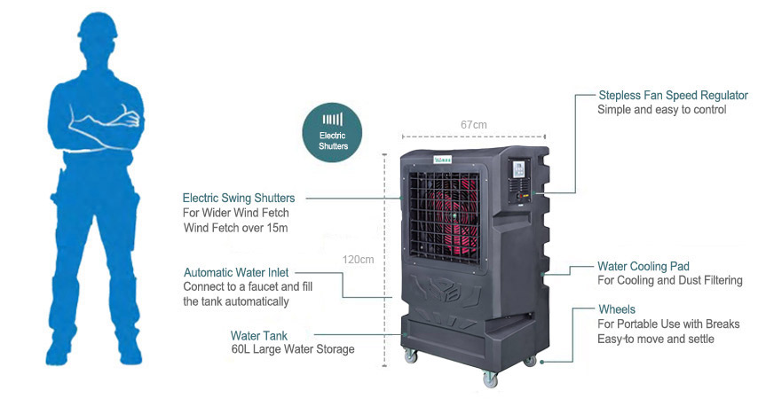 M102-COOL is een mobiele aircooler voor commercieel gebruik. Dit toestel is het kleinste model in de Ya Suh Dar serie en daardoor bijzonder geschikt voor beperkte ruimtes binnen en buiten. Geschikt voor fabrieken, werkplaatsen, kassen, veeteelt, restaurants, winkels en evenementenlocaties etc.. Deze adiabatische koeler filtert het stof en zorgt voor verkoeling van de omgevingslucht met water.