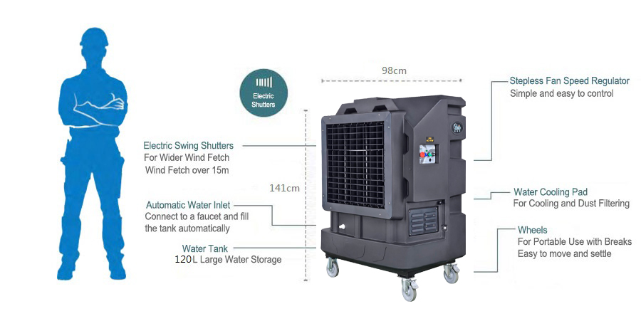 De Ya Suh Dar M802-COOL verdampingskoeler is een mobiele, adiabatische luchtkoeler voor professioneel gebruik. Dit apparaat maakt deel uit van de Ya Suh Dar-serie en is bijzonder geschikt voor het koelen van binnen- en buitenruimtes.