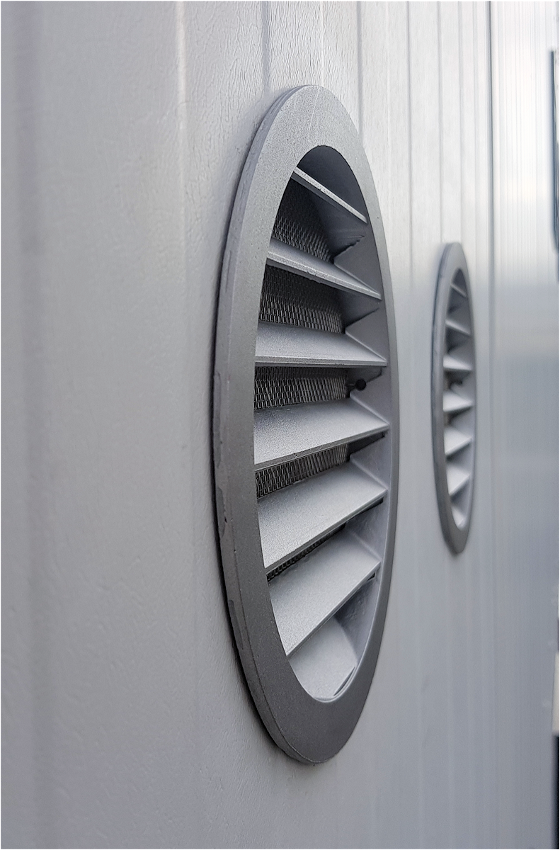 Stalen roosters met gaas tegen vervuilingen, vandalisme-bestendig door de solide constructie Deze roosters werken zonder de geveerde kleppen van de standaard meegeleverde roosters van de 15HP Innova 2.0 Monoblock airco’s.