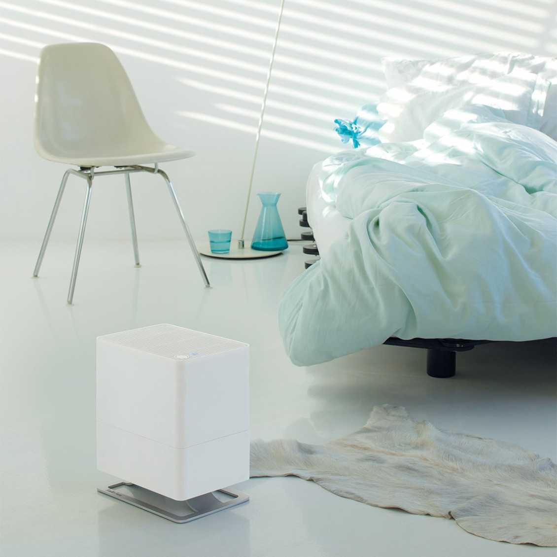 Kleine koudwaterverdamper: StadlerForm Oskar Little, een compacte en markante luchtbevochtiger voor een kleine slaapkamer.