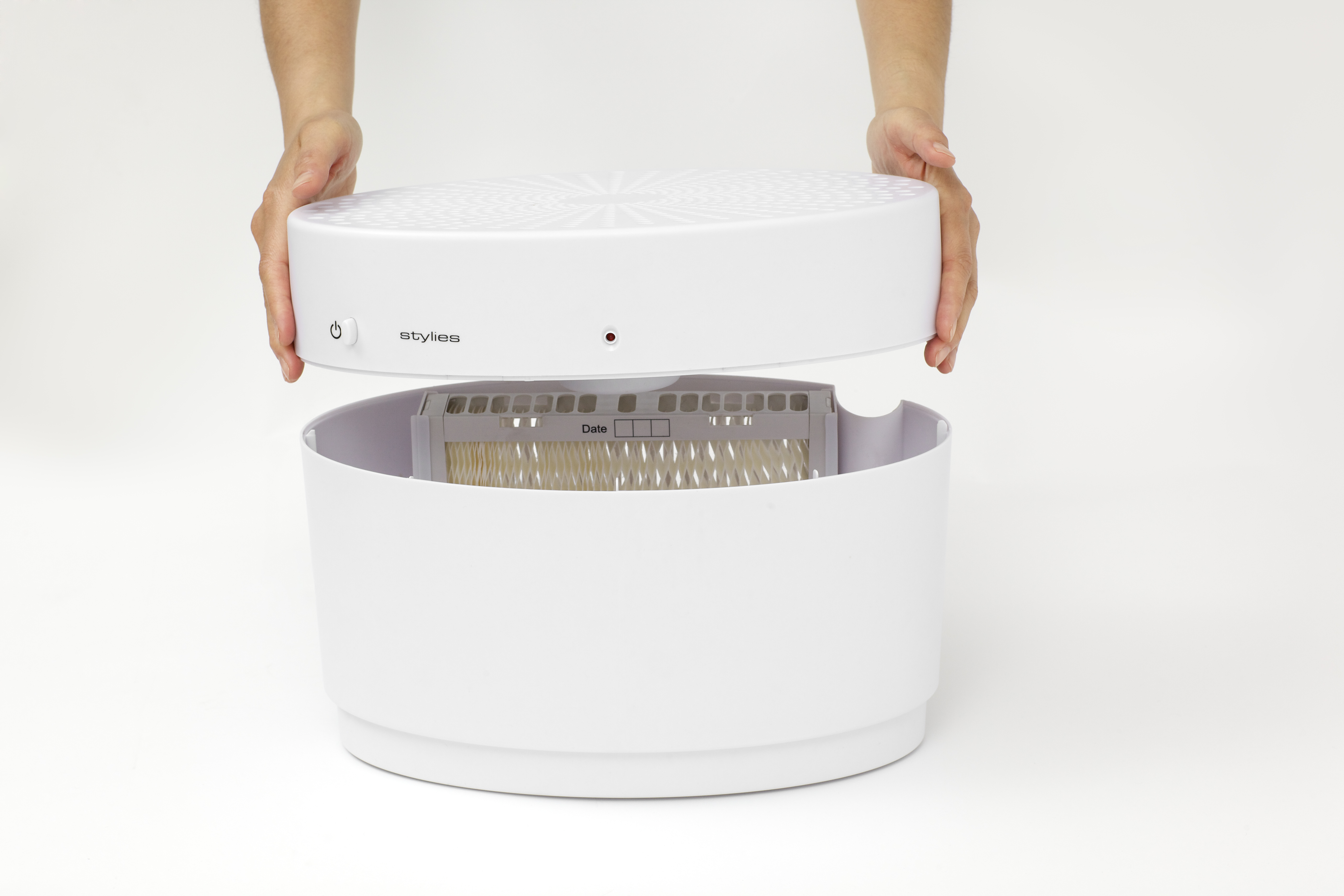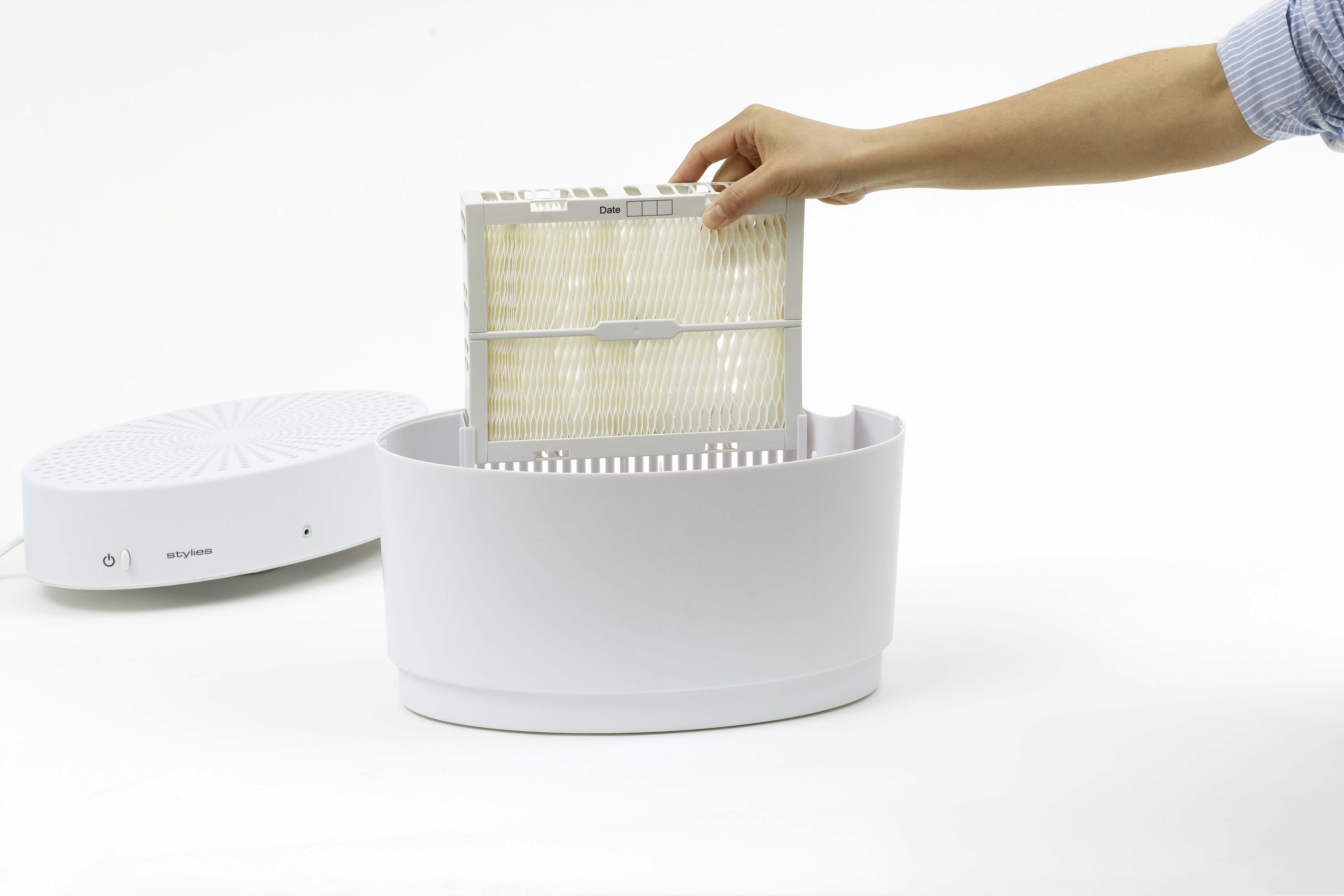 Luchtbevochtiger Stylies Carina is klein en maakt weinig geluid. Deze bevochtiger is geschikt voor kleine kamers, bijvoorbeeld een slaapkamer voor kind of baby. De lucht wordt op natuurlijke wijze - koud water verdamping - bevochtigd. Ook worden kleine deeltjes verwijderd die in de lucht zweven (stof, pollen). Voor een goede, hygiënische luchtbevochtiging dient men het anti-bacteriële verdampingsfilter van de luchtbevochtiger elke 3 maanden te vervangen.