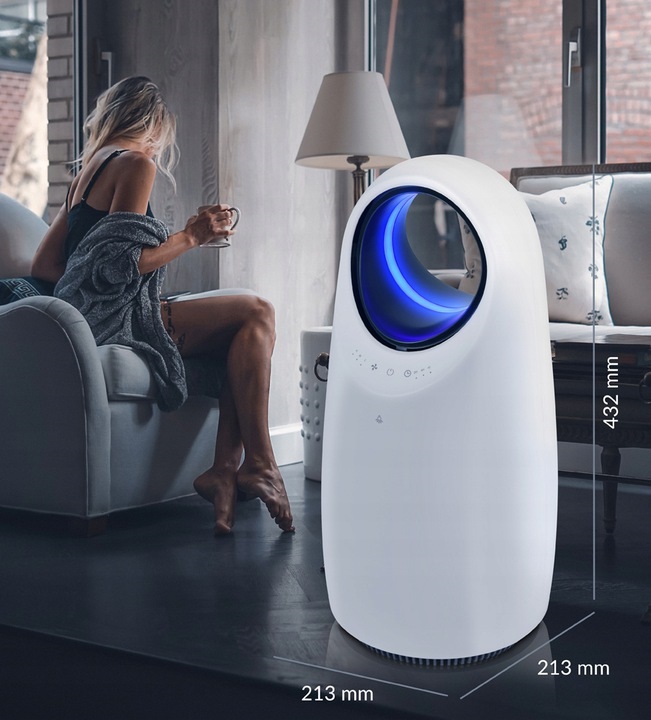 Dankzij zijn cilindrische vorm en zijn drie - in - één filter verwijdert luchtreiniger Blaupunkt Lavender AIRing 99,95% van de vervuilende stoffen uit de lucht.