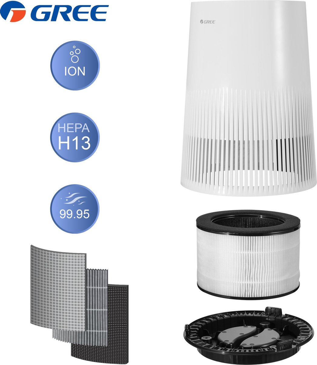 De Gree Falcon Luchtreiniger is standaard uitgevoerd met een HEPA- & Actief Koolstoffilter. Het HEPA Filter zorgt ervoor dat fijnstof (PM2.5) uit de ruimte gehaald wordt en het Actief Koolstoffilter haalt de geuren uit de ruimte. De Gree Falcon Luchtreiniger is een complete luchtreiniger en heeft de 'Design Award 2020' gewonnen. Eenvoudige en gebruiksvriendelijke bediening maakt de Gree Falcon toepasbaar in elke ruimte. Kenmerken 'Touch' toets bediening LED Verlichting met indicatie luchtkwaliteit Compact en stijlvol design (winnaar Design Award 2020) Uitgevoerd met een 'tripple' filter
