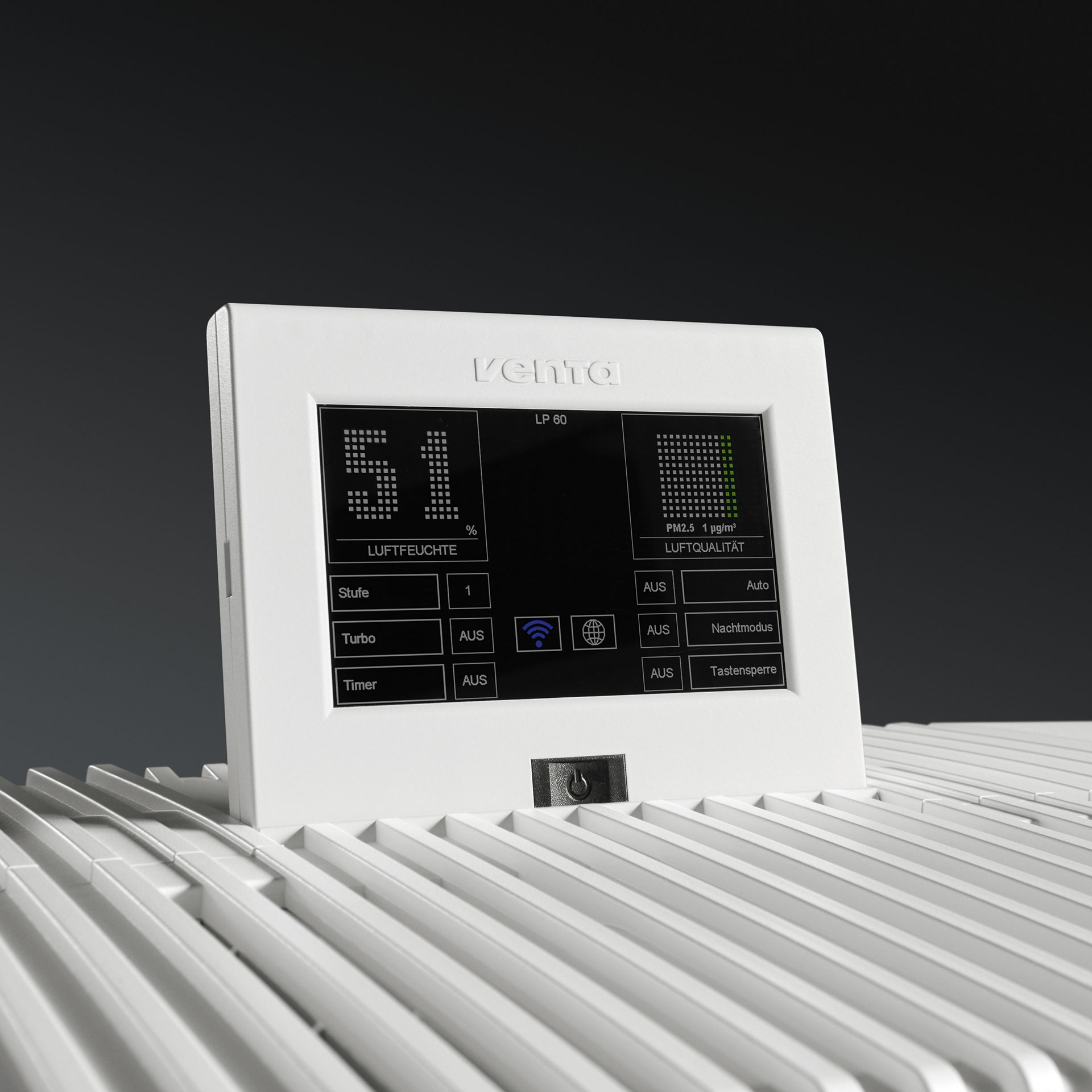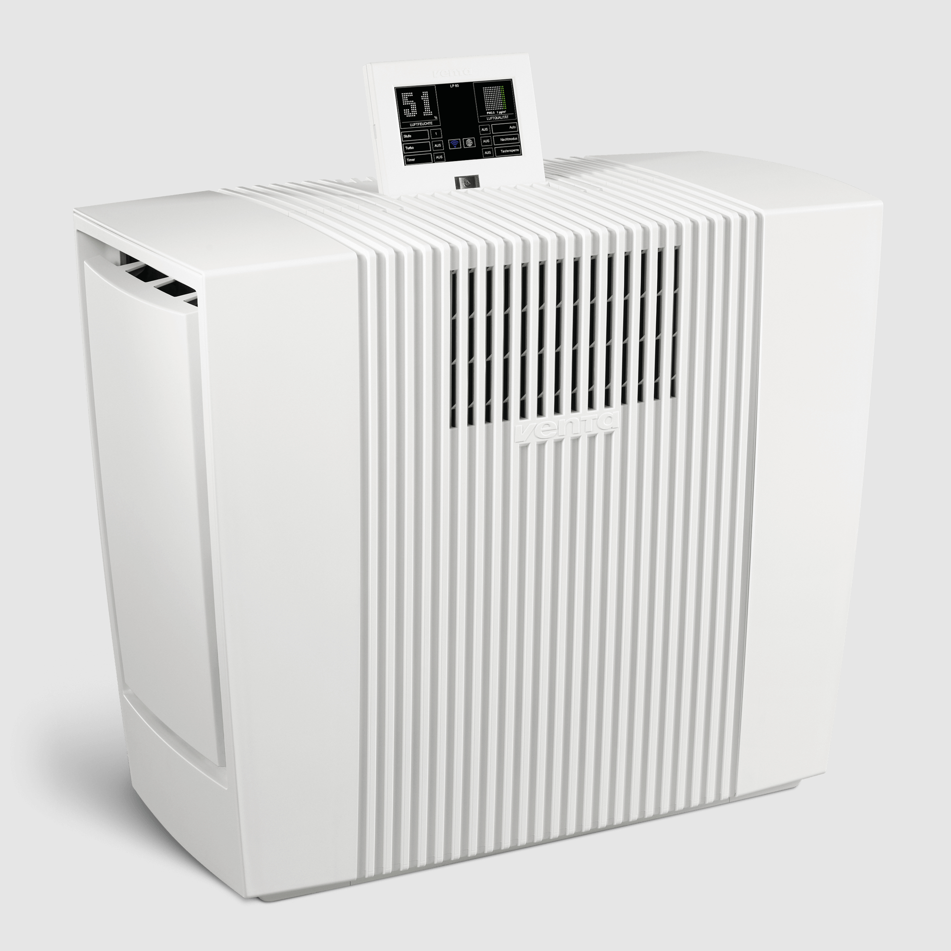 Venta LP60 WiFi luchtreiniger voor grote ruimtes. Met WiFi voor bediening op afstand via een app. Met de Venta LP60 WiFi Luchtreiniger wordt het assortiment Venta apparaten uitgebreid met een wereldprimeur. Door de Venta Dual-Filter technologie is deze slimme luchtreiniger met een filterrendement van 99,95 % sterker dan alle anderen. Zelfs virussen met een grootte van 0,07 micron hebben geen schijn van kans. Het VENTAcel Nelior filter (H13 volgens EN1822) zorgt er bijvoorbeeld voor dat zelfs griepvirussen in de lucht worden verwijderd. Geen enkele vergelijkbare luchtreiniger op de markt is daartoe in staat! De Venta LP60 Luchtreiniger ontdoet de lucht in ruimten tot 75 m² snel en effectief van onder andere bacteriën, virussen, pollen en schimmelsporen. De Venta LP60 Luchtreiniger verwijdert naast sigarettenrook ook andere gasvormige substanties en chemicaliën uit de lucht. Unieke prestaties. Uniek verbruik en ook nog eens uniek stil Hoewel de Venta LP60 Luchtreiniger buitengewoon krachtig reinigt, is hij ook nog eens bijzonder duurzaam. Hij wordt geproduceerd met 100% groene stroom, is 100% recyclebaar en ligt ook bij het energieverbruik aan de top; op stand 1 verbruikt hij slechts 7 Watt. De energiekosten komen daarmee op ca. € 20,- per jaar. Hij is 19 dB(A) (op stand 1) en in tegenstelling tot de concurrentie ook echt fluisterstil. Geen enkel apparaat van de concurrentie komt hierbij in de buurt. Ook de aromafunctie met de nieuwe Venta Aroma capsules is uniek ten opzichte van de concurrentie. En het design? Dat heeft zelfs een prijs verdiend; de Venta LP60 Luchtreiniger is namelijk onderscheiden met de 'Reddot' Award 2017. Daarnaast is deze wereldprimeur bijzonder eenvoudig te bedienen. Dankzij WiFi kan de Venta LP60 WiFi op elk moment vanaf elke locatie met de kosteloze Venta app (iOS/Android) op afstand worden bediend. Fluisterstil en zeer krachtig Nieuwe unieke Venta Dual-Filter technologie 99,95% filtratie-efficiëntie Effectief tegen pollen, huisstof, huisstofmijt, sigarettenrook Effectief tegen deeltjes tot een grootte van 0,07 micron – zelfs tegen griepvirussen Zeer krachtig en stil tegelijk Laag energieverbruik (op stand 1 slechts 7 Watt = ca. € 20/jaar) Met interactieve touchscreen en afstandsbediening Met WiFi voor bediening op afstand via een kosteloze app (Android/iOS)