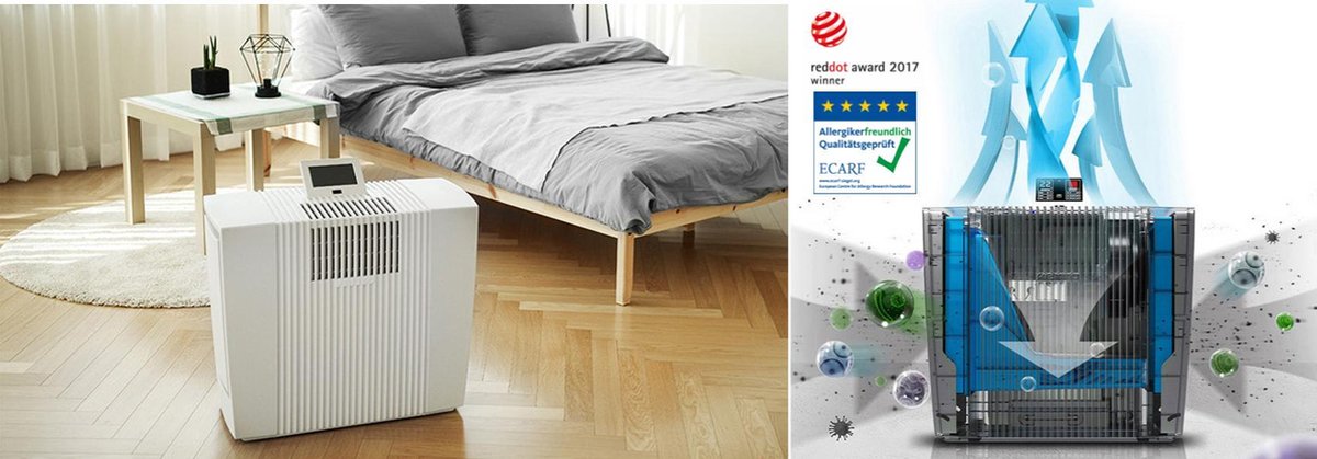Venta LP60 luchtreiniger voor grote ruimtes. Met de Venta LP60 luchtreiniger wordt het assortiment Venta apparaten uitgebreid met een wereldprimeur. Door de Venta Dual-Filter technologie is deze luchtreiniger met een filterrendement van 99,95 % sterker dan alle anderen. Zelfs virussen met een grootte van 0,07 micron hebben geen schijn van kans. Het VENTAcel Nelior filter (H13 volgens EN1822) zorgt er bijvoorbeeld voor dat zelfs griepvirussen in de lucht worden verwijderd. WINNAAR 'REDDOT' AWARD. Verkrijgbaar in de kleuren Zwart en Wit!