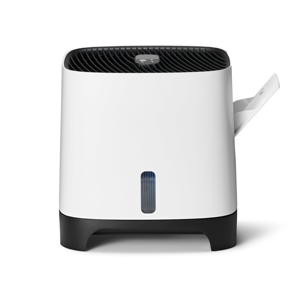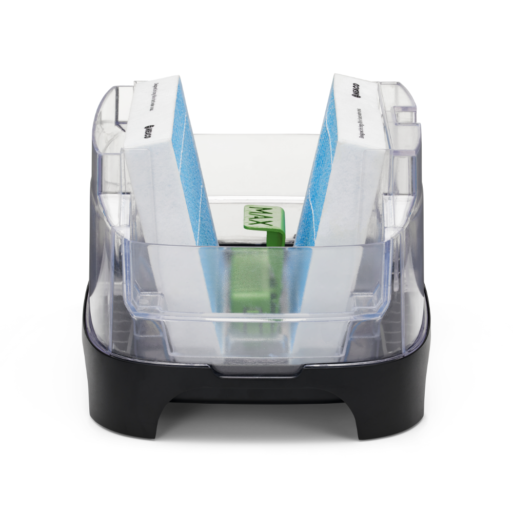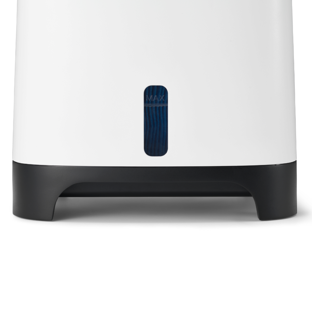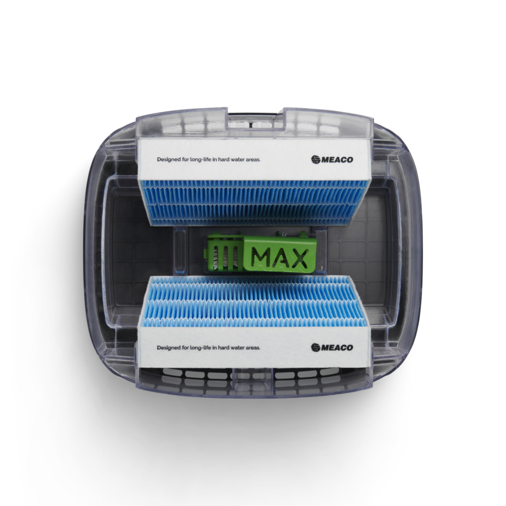 Armin bevochtigt met puur kraanwater Armin 300 bevochtigt de lucht met zuiver water. Vul hem met puur kraanwater, het water heeft geen speciale behandeling nodig. Het toevoegen van een middel voor waterbehandeling is niet nodig. Armin is weinig gevoelig voor kalk in het water. Hij is te gebruiken in gebieden met zacht water en met hard water. De verdampingsbevochtiger verhoogt de vochtigheidsgraad zoals de natuur doet. Een ventilator blaast lucht langs de vochtige verdampingsfilters, dit is te vergelijken met wind die over de zee blaast. Het water in het reservoir van Armin 300 blijft vrij van bacteriën en algen dankzij de Silvertex® watersterilisatiepad, gecombineerd met een antimicrobiële coating op de verdampingsfilters. Dubbele aanzuiging van droge lucht, twee verdampingsfilters Armin 300 verhoogt de luchtvochtigheid snel en gelijkmatig. De bevochtiger is uitgerust met twee verdampingsfilters. Droge lucht wordt aan beide zijde van het apparaat langs een vochtig filter gevoerd. Na het bevochtigen wordt de geconditioneerde lucht in één luchtstroom in de kamer verdeeld. Omdat de bevochtiger de droge lucht aan twee kanten van het apparaat aanzuigt, zal de hele kamer sneller de goede luchtvochtigheid krijgen. Schone lucht, vrij van kalk De dubbele verdampingsfilters in Armin 300 nemen vocht uit het waterreservoir op, en verdelen dit in de droge omgevingslucht. Tijdens dit proces blijven kalkdeeltjes op het filter achter waardoor ze niet in de omgeving terecht komen. Armin veroorzaakt dus geen witte neerslag in de kamer. Armin's verdampingsfilters hebben een lange levensduur. Ze kunnen tot vier keer worden gedraaid, waardoor hun levensduur wordt gemaximaliseerd voordat vervanging nodig is. Silvertex® watersterilisatiepad Armin is de enige Europese luchtbevochtiger die gebruik maakt van de innovatieve watersterilisatiepad Silvertex®, deze is gemaakt van puur zilver en PET. Silvertex® laat zilverionen vrij in het water, waardoor de groei van ziektekiemen en micro-organismen wordt voorkomen. Dit zorgt ervoor dat het water zuiver blijft en voorkomt dat bacteriën zich verspreiden in de lucht die u inademt. Met een levensduur van maximaal een jaar levert Silvertex® langdurige, betrouwbare prestaties voor een gezondere omgeving. Kenmerken van Meaco Armin 300 Ingebouwde hygrostaat Dubbele aanzuiging van droge lucht Weinig onderhoud Makkelijk van bovenaf te vullen Gemakkelijk schoonmaken Vaatwasserbestendige watertank Hoge verdampingssnelheid Laag geluidsniveau Nachtmodus Energiezuinig Silvertex® watersterilisatiepad Antimicrobiële coating op verdampingsfilters Intuïtieve bediening met 3 standen