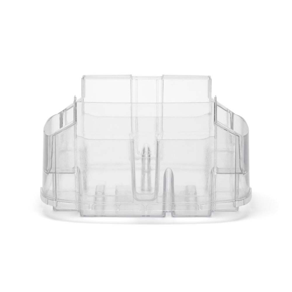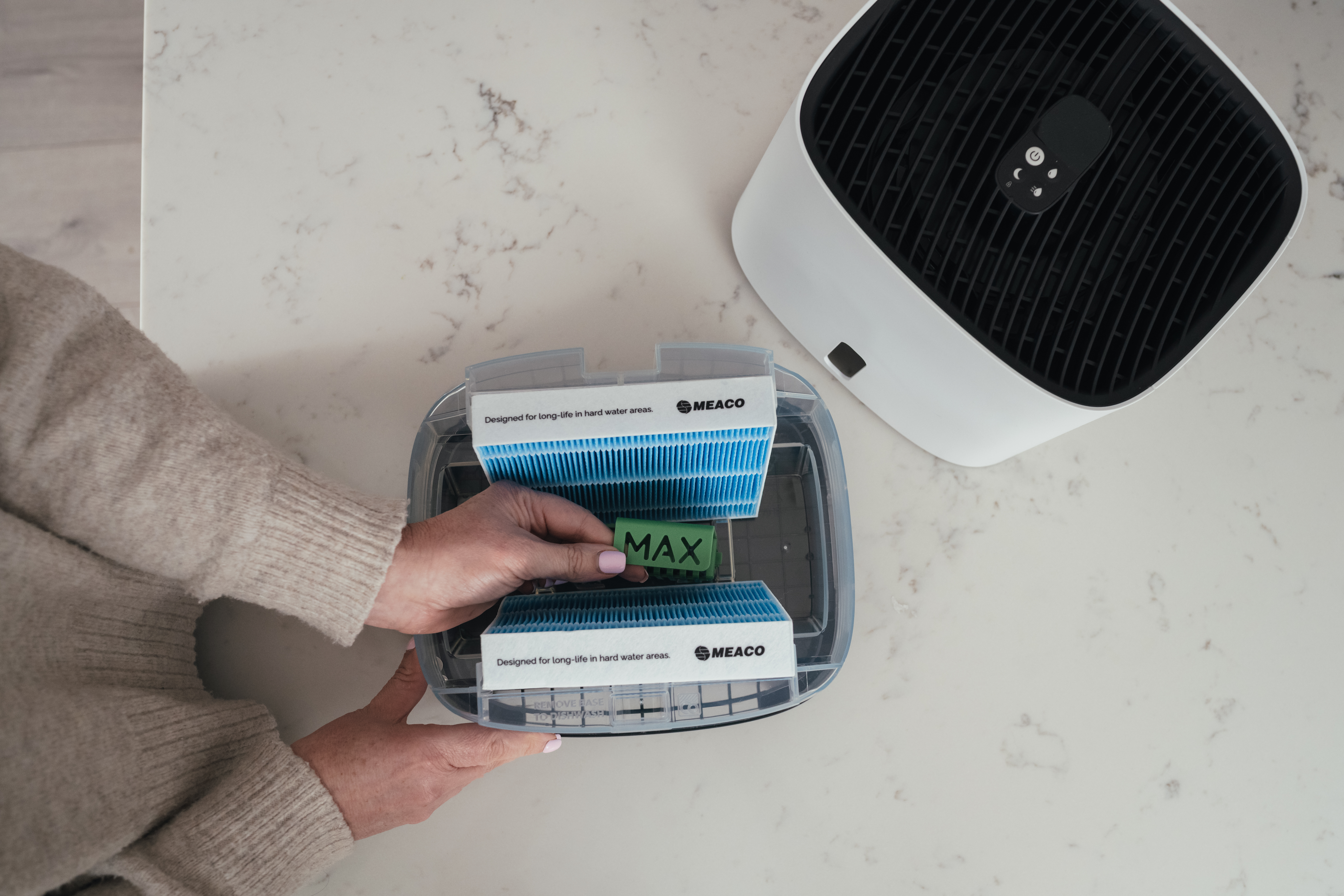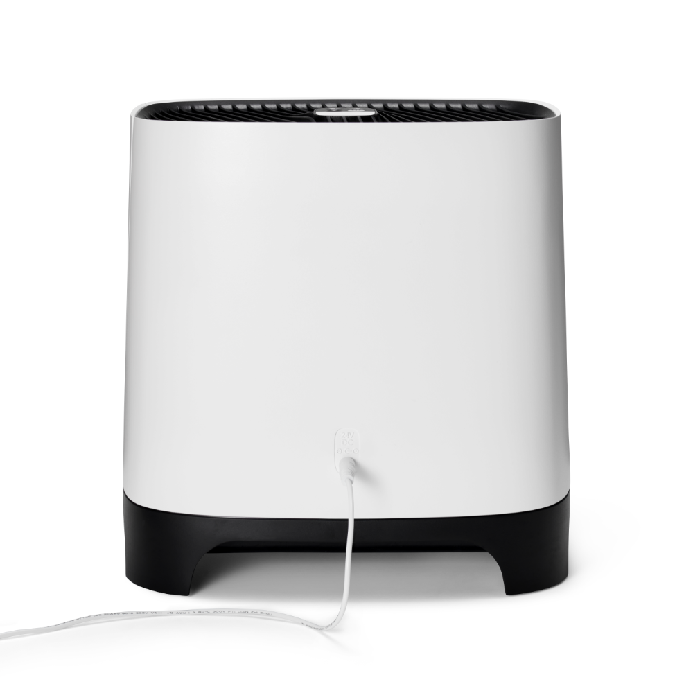 Armin bevochtigt met puur kraanwater Armin 300 bevochtigt de lucht met zuiver water. Vul hem met puur kraanwater, het water heeft geen speciale behandeling nodig. Het toevoegen van een middel voor waterbehandeling is niet nodig. Armin is weinig gevoelig voor kalk in het water. Hij is te gebruiken in gebieden met zacht water en met hard water. De verdampingsbevochtiger verhoogt de vochtigheidsgraad zoals de natuur doet. Een ventilator blaast lucht langs de vochtige verdampingsfilters, dit is te vergelijken met wind die over de zee blaast. Het water in het reservoir van Armin 300 blijft vrij van bacteriën en algen dankzij de Silvertex® watersterilisatiepad, gecombineerd met een antimicrobiële coating op de verdampingsfilters. Dubbele aanzuiging van droge lucht, twee verdampingsfilters Armin 300 verhoogt de luchtvochtigheid snel en gelijkmatig. De bevochtiger is uitgerust met twee verdampingsfilters. Droge lucht wordt aan beide zijde van het apparaat langs een vochtig filter gevoerd. Na het bevochtigen wordt de geconditioneerde lucht in één luchtstroom in de kamer verdeeld. Omdat de bevochtiger de droge lucht aan twee kanten van het apparaat aanzuigt, zal de hele kamer sneller de goede luchtvochtigheid krijgen. Schone lucht, vrij van kalk De dubbele verdampingsfilters in Armin 300 nemen vocht uit het waterreservoir op, en verdelen dit in de droge omgevingslucht. Tijdens dit proces blijven kalkdeeltjes op het filter achter waardoor ze niet in de omgeving terecht komen. Armin veroorzaakt dus geen witte neerslag in de kamer. Armin's verdampingsfilters hebben een lange levensduur. Ze kunnen tot vier keer worden gedraaid, waardoor hun levensduur wordt gemaximaliseerd voordat vervanging nodig is. Silvertex® watersterilisatiepad Armin is de enige Europese luchtbevochtiger die gebruik maakt van de innovatieve watersterilisatiepad Silvertex®, deze is gemaakt van puur zilver en PET. Silvertex® laat zilverionen vrij in het water, waardoor de groei van ziektekiemen en micro-organismen wordt voorkomen. Dit zorgt ervoor dat het water zuiver blijft en voorkomt dat bacteriën zich verspreiden in de lucht die u inademt. Met een levensduur van maximaal een jaar levert Silvertex® langdurige, betrouwbare prestaties voor een gezondere omgeving. Kenmerken van Meaco Armin 300 Ingebouwde hygrostaat Dubbele aanzuiging van droge lucht Weinig onderhoud Makkelijk van bovenaf te vullen Gemakkelijk schoonmaken Vaatwasserbestendige watertank Hoge verdampingssnelheid Laag geluidsniveau Nachtmodus Energiezuinig Silvertex® watersterilisatiepad Antimicrobiële coating op verdampingsfilters Intuïtieve bediening met 3 standen
