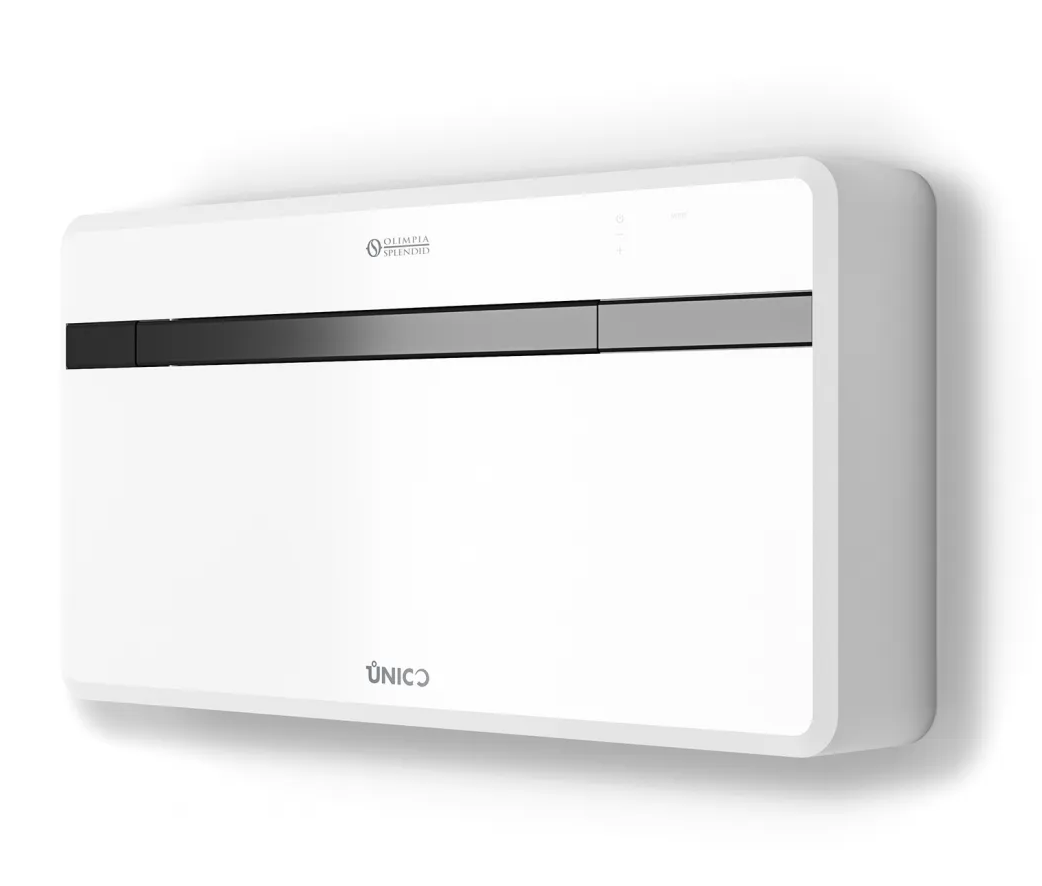 Monoblock airco met een fluisterstil geluidsniveau vanaf slechts 27 dB(A) Monoblock airconditioner Unico EVO-F 16 HP PVA is voorzien van een invertertechnologie met twin rotary-compressor, die een nauwkeurige temperatuurregeling garandeert en een fluisterstille werking biedt: het geluidsniveau start vanaf slechts 27 dB(A). De Unico EVO-F 16 HP PVA is de perfecte oplossing voor wie zoekt naar efficiënte verwarming en koeling zonder in te boeten op design of esthetiek. Dankzij de innovatieve technologie van een geïntegreerde warmtepomp heeft dit toestel geen buitenunit nodig – enkel twee discrete roosters aan de gevel. Zo blijft de uitstraling van je woning of gebouw intact, wat het systeem ideaal maakt voor appartementen, monumentale panden of woningen met architectonische beperkingen. Ook te integreren in gebouwbeheersystemen (BMS) De EVO-F beschikt over een helder, verlicht display en wordt geleverd met een afstandsbediening. Dankzij de Modbus RTU-aansluiting (RS-485) is het apparaat ook te integreren in gebouwbeheersystemen (BMS). Modi zoals automatisch, ventilatie, ontvochtiging, verwarming, koeling en een speciale Energy Boost-functie zorgen voor een optimaal binnenklimaat in elk seizoen. Monoblock airconditioner met natuurlijk koudemiddel R290 De EVO-F 16 HP werkt met het natuurlijke koudemiddel R290, dat een extreem lage Global Warming Potential (GWP ≈ 3) heeft. Dit maakt het systeem niet alleen milieuvriendelijk, maar ook klaar voor de toekomst volgens de nieuwste EU-richtlijnen op het gebied van klimaatbeheersing. De voorzijde van het toestel is gemaakt van 100% gerecycled kunststof, afkomstig van post-consumptiemateriaal. Niet alleen stijlvol in zwart uitgevoerd, maar ook een statement voor een circulaire economie. De verpakking is bovendien grotendeels plasticvrij en volledig recyclebaar. Kenmerken van Airco Zonder Buitenunit Olimpia Splendid Unico EVO-F 16 HP PVA Geen buitenunit nodig – enkel twee luchtroosters aan de gevel Stil, krachtig en compact Milieuvriendelijk dankzij R290 en gerecyclede materialen Energie-efficiënt: Klasse A in koelen en verwarmen Ideaal voor appartementen, hotels, kantoren of monumentale panden Eenvoudige installatie en minimaal onderhoud Koelvermogen: 1,6 kW nominaal (max. 2,1 kW) Verwarmingsvermogen: 1,5 kW nominaal (max. 2,1 kW) Energieklasse: A (zowel voor koelen als verwarmen) Geluidsniveau: van 27 tot 42 dB(A) Luchtstroom (intern): tot 380 m³/h Ontvochtigingscapaciteit: 0,7 liter/uur Refrigerant: R290 – 0,145 kg vulling Voeding: 230 V ~ 50 Hz Condensafvoer: vereist vaste aansluiting bij gebruik als warmtepomp