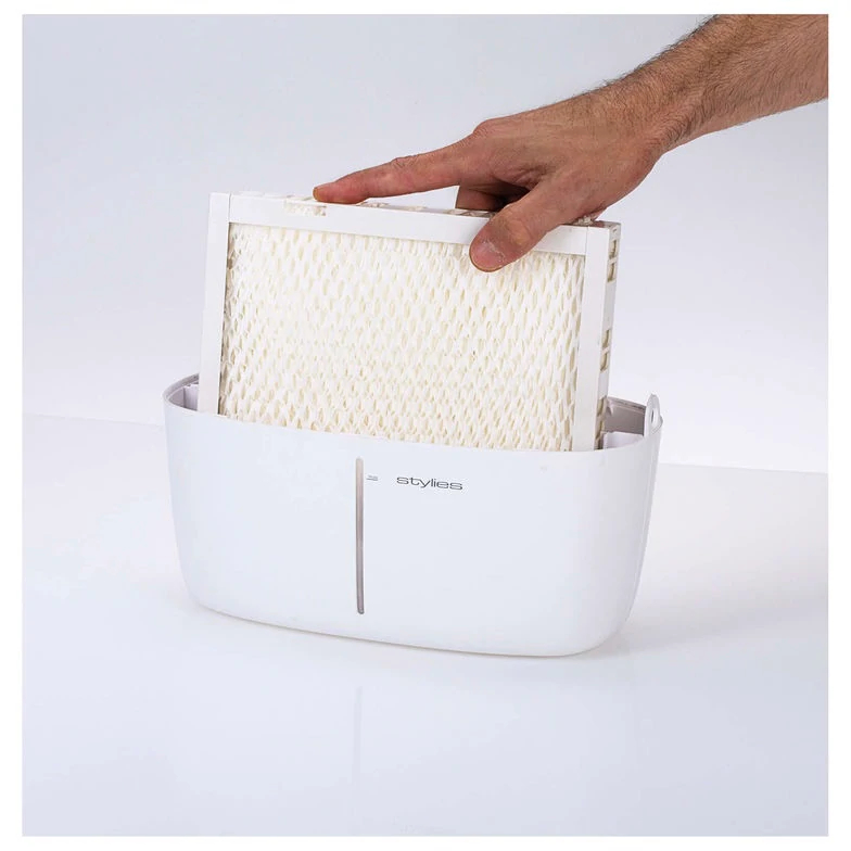 Bevochtiger Stylies Alaze Pro is een koudwaterverdamper. De luchtbevochtiger met antibacteriële filter bevochtigt en reinigt de lucht. De Stylies Alaze Pro is geschikt voor luchtbevochtiging in ruimtes tot 110 m³ (40m²) en past in de auto mode de snelheid automatisch aan. Zeer geschikt voor klimaatbeheersing in een kleine kamer, kinderkamer en babykamer. EXTRA: bediening op afstand met behulp van de app Deze Stylies Alaze Pro is uitgerust met WiFi zodat u de bevochtiger op afstand kunt bedienen. Stel overal vandaan de Alaze Pro in zodat u altijd kunt genieten van de juiste luchtvochtigheid. Kenmerken luchtbevochtiger Alaze Pro Geschikt voor ruimtes tot 110 m³ (40 m²). Bediening op afstand met behulp van de app Inhoud waterreservoir 3 Liter. Automatische modus. Nachtmodus. Timer functie. Sensortoetsen bediening. Zeer gebruiksvriendelijke luchtbevochtiger. DAST: Direct Air Stream Technology Dankzij deze gepatenteerde technologie vloeit de actieve luchtstroom rechtstreeks naar de antibacteriële filtermat, waardoor dit apparaat een luchtbevochtigingscapaciteit bereikt die 30% hoger ligt en dit met 30% minder energie. Technische details DAST-technologie Eenvoudige bediening op afstand met behulp van de app Geluid: < 27 dB(A) Vermogen: 2,5 Watt Opp.: 40 m2 / 110 m3
