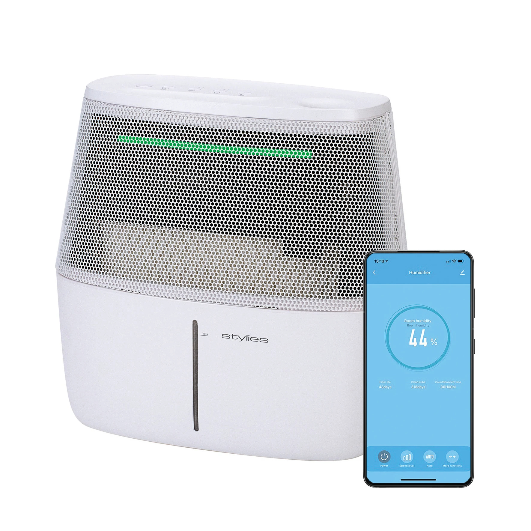 Deze luchtbevochtiger van Stylies bevochtigt, reinigt én verkoelt de lucht in uw woonruimtes. Dankzij een gepatenteerde technologie heeft het toestel een 30% hogere luchtvochtigheidscapaciteit. De bevochtiger is ideaal voor slaapkamers en kinderkamers dankzij de nachtmodus waardoor alle LED lichten uitgaan. Bovendien is de bediening van het apparaat zeer praktisch dankzij de besturing op afstand via een app.