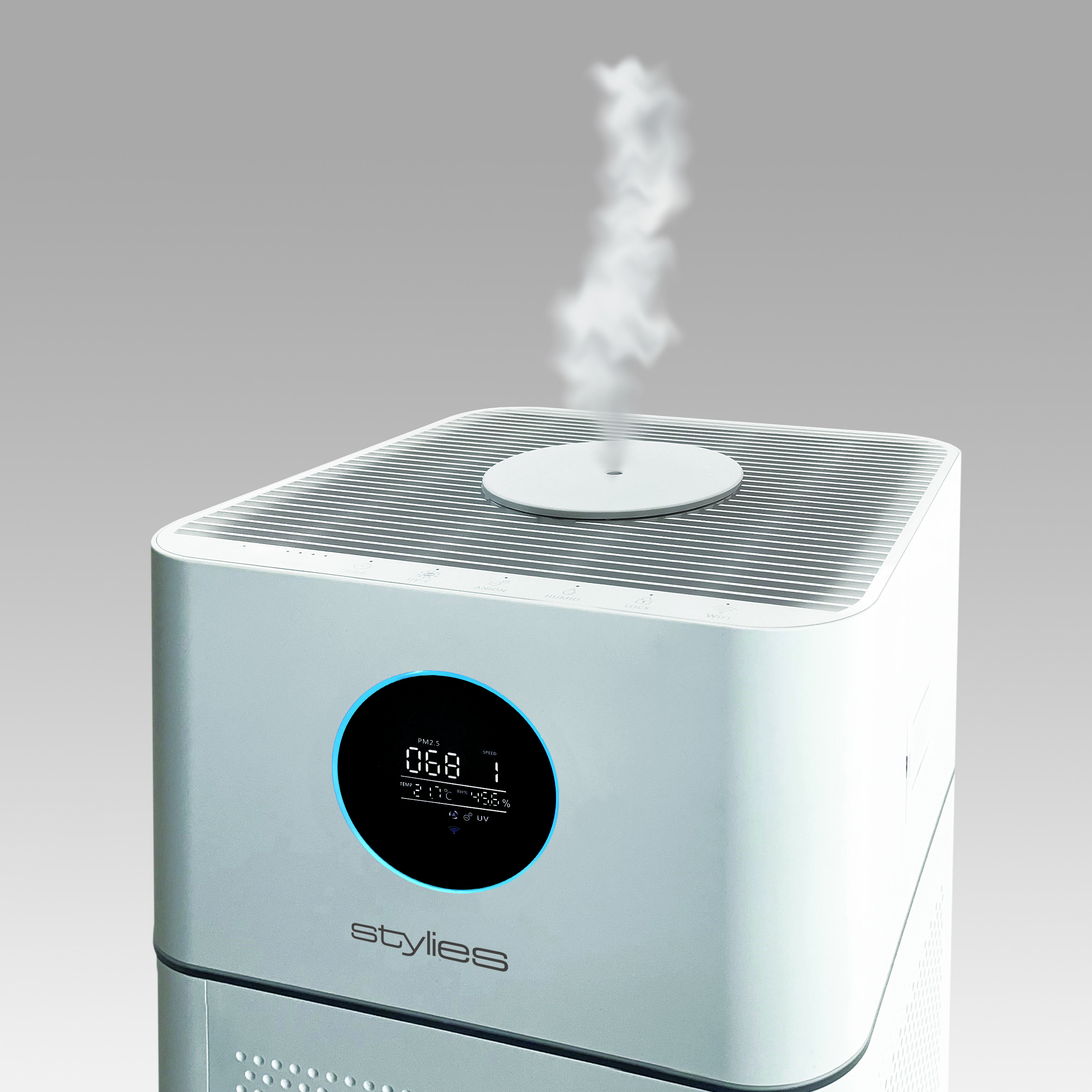 Stylies Alpha, een hypermoderne luchtreiniger De Stylies Alpha luchtreiniger zal de luchtkwaliteit in uw kamers verbeteren. Het is 's werelds eerste luchtreiniger met een gecertificeerde SARS-COV-2-filtratiesnelheid van 100%. Het universitair laboratorium CROP heeft bevestigd dat de luchtreiniger Alpha 100% SARS-COV-2-deeltjes filtert en 99,9% daarvan op het gezuiverde filteroppervlak elimineert door middel van UV-licht. Uitvoerige functies Stylies Alpha heeft een CADR luchtverplaatsing van 600 m³ per uur. Met zijn sierlijke LED verlichting geeft de luchtreiniger aan of de binnenlucht schoon of vies is. Naast luchtreiniging is ook luchtbevochtiging mogelijk met deze compleet uitgevoerde reiniger. Schakel de stand bevochtiging in, en hij voegt water aan de schone lucht toe. Uitgebreide bediening Stylies Alpha kan je op meerdere manier bedienen, via het bedieningspaneel, met de afstandsbediening of via een app op je smartphone. Schakel de luchtreiniger op de automatische stand of op één van de vijf handmatige standen. Stel zijn timer in zodat hij alleen werkt wanneer dat nodig is. Kenmerken van de Stylies Alpha luchtreiniger Vermogensniveau’s (1 – 5) Gecombineerd actief kool- en HEPA-filter voor rook, stof, pollen, schadelijke stoffen UV-C ontsmetting Aan / Uit Ionisatie Luchtsensor LED luchtkwaliteit indicatie Timer Kinderslot Afstandsbediening WiFi koppeling voor app