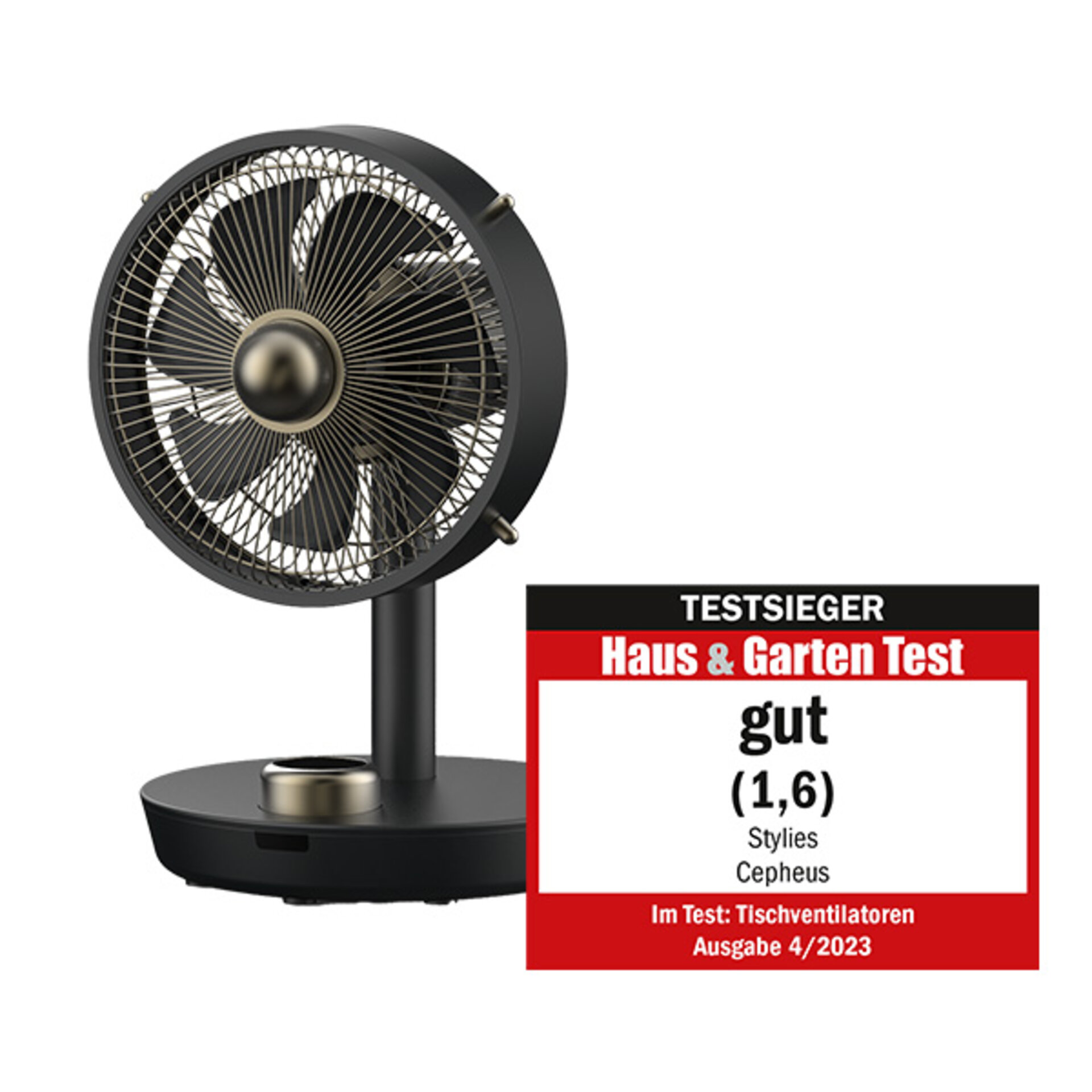 Cepheus is de meest elegante en mooiste tafelventilator van Stylies. Hij is gemaakt van metaal en zeer degelijk afgewerkt. Het design is prachtig, het ontwerp wordt versterkt door de mooie antraciet kleur. Stylies Cepheus is uitgerust met een krachtige DC motor die zorgt voor een soepele en stille werking. Met 12 snelheden stel je hem perefect in, van een zacht briesje tot een stevige windvlaag. 'Winnaar 'Haus & Garten Tests Magazine 2023'