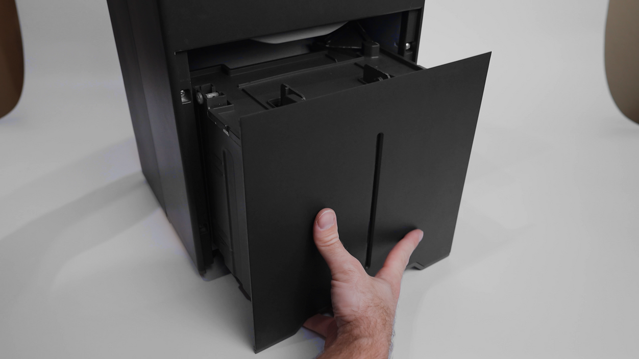 Het onttrokken water wordt opgevangen in een interne watertank met waterniveau-indicator. Zodra de tank vol is, stopt het apparaat automatisch en wordt dit duidelijk aangegeven. Voor langdurig gebruik is ook continue afvoer via een slang mogelijk.