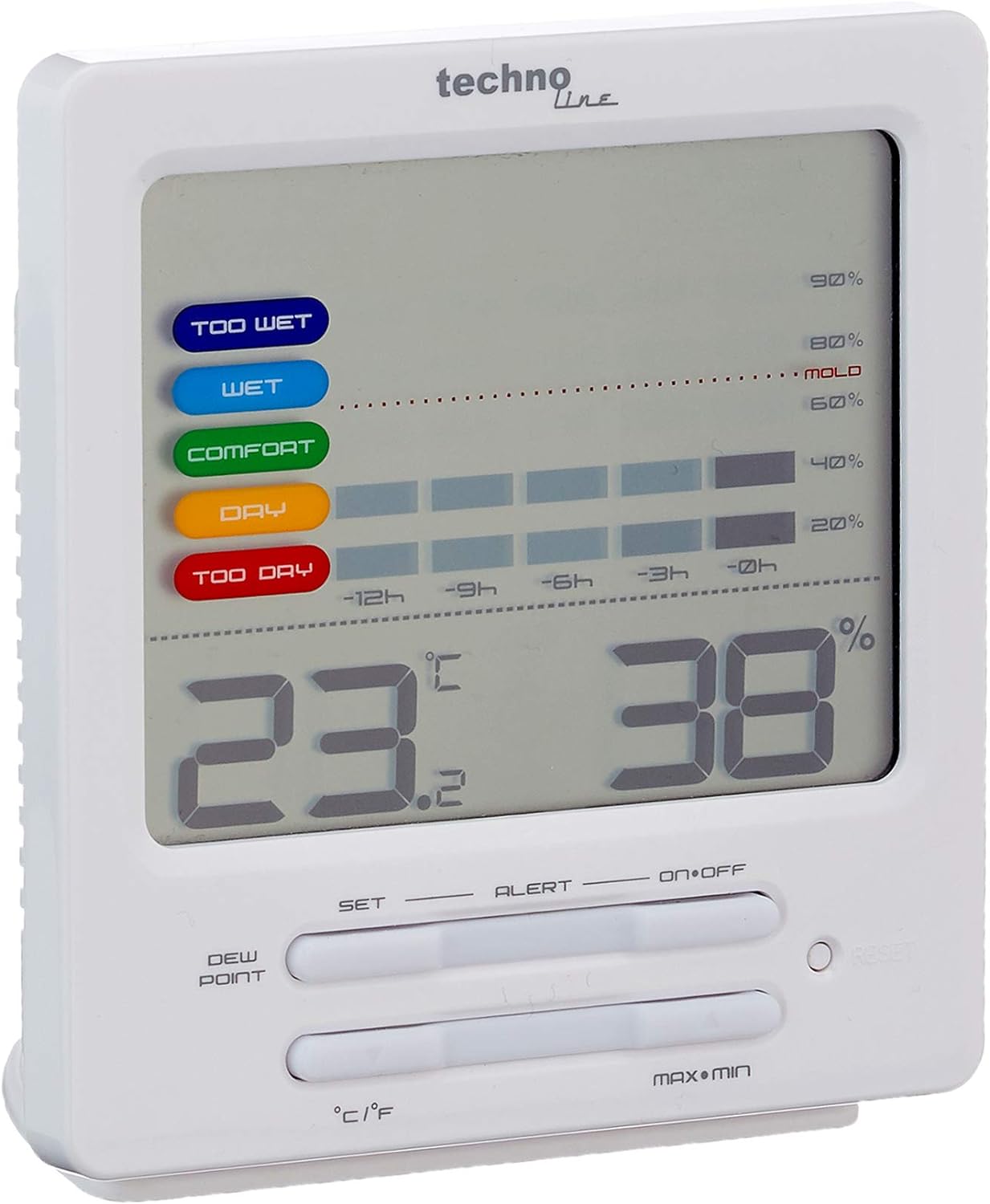 Thermo-Hygrometer Technoline WS 9420 heeft een klassieke vormgeving. Zijn display laat het verloop van de luchtvochtigheid duidelijk zien. De digitale hygrometer toont een kleurcode bij het overzicht zodat je snel ziet of het droog, comfortabel of vochtig is.