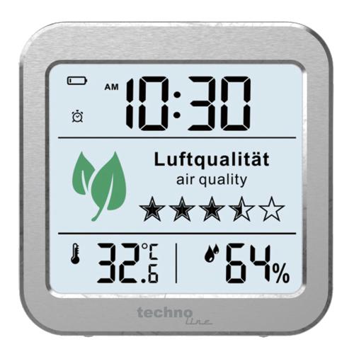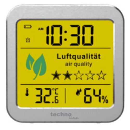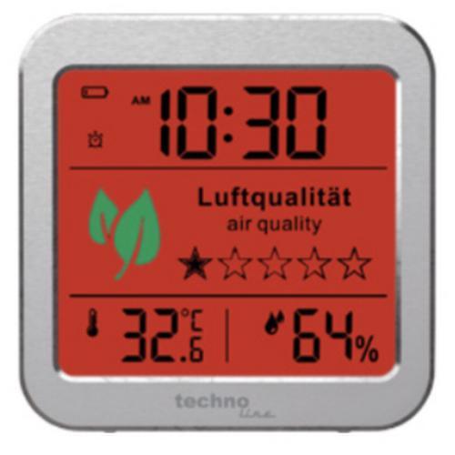 De Technoline WL 1020 is een Air Quality Meter die buiten het weergeven van de temperatuur en luchtvochtigheid ook de luchtkwaliteit meet. De luchtkwaliteit wordt op twee verschillende manieren weergegeven: Een 5 sterren symbool geeft in 11 niveau's de luchtkwaliteit aan. De kleur van de achtergrond veranderd. Bij WIT is deze goed, bij GEEL ventilatie is nodig en bij ROOD ventilatie is noodzakelijk.