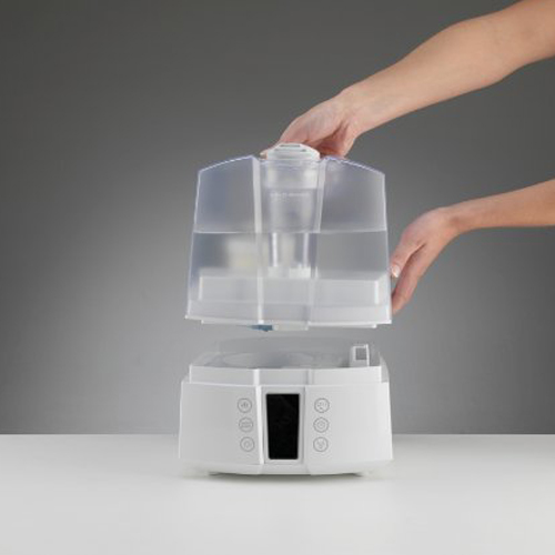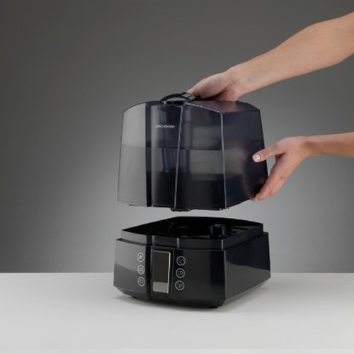 Ultrasone luchtbevochtiger: Blaast geruisloos water in een micro-fijne nevel in de ruimte. De stille luchtbevochtiger werkt volautomatisch dankzij zijn digitale hygrostaat. Bevochtiger met een modern design en ideaal voor snelle luchtbevochtiging. Verkrijgbaar in de kleuren zwart en wit!