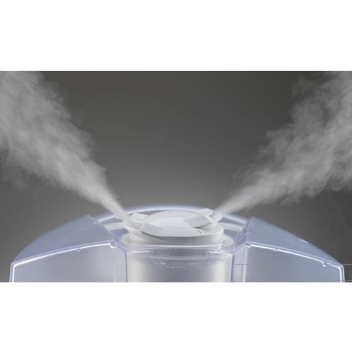 Ultrasone luchtbevochtiging is een zeer effectieve bevochtigingstechniek waarbij het water met hoog frequente trillingen in een fijne nevel wordt omgevormd. De nevel van de luchtbevochtiger wordt krachtig in de omgevingslucht verspreidt zodat de kleine waterdeeltjes de hele ruimte bevochtigen. In een ultrasone luchtbevochtiger worden door hoogfrequentie alle in het water voorkomende verontreinigingen - zoals bacteriën, microben, schimmels - gedood. Het is dus een veilige wijze van lucht bevochtigen. De nevel is opgewarmd zodat de temperatuur van de omgeving niet wordt verlaagd*. Comfortabel de luchtvochtigheid verhogen met deze Boneco 7147 luchtbevochtiger. De ultrasoon bevochtiger verbruikt weinig stroom in vergelijking met een stoomverdamper (40W tot maximaal 140W). De Boneco 7147 heeft een ingebouwde hygrostaat (luchtbevochtiger met hygrometer en regelaar) en werkt volledig digitaal. Deze bevochtiger is instelbaar op elk gewenst vochtigheids-niveau. De fijne nevel is separaat te regelen. Het ontkalkingspatroon zorgt voor een hygiënisch schone nevel zonder kalk en deeltjes van mineralen (geen witte stof neerslag). Dit patroon moet regelmatig worden vervangen, minstens 1 keer per gebruiksperiode of per 'stookseizoen', de periode dat bevochtiging noodzakelijk is door gebruik van verwarming of kachel. Deze ultrasone Boneco 7147 is een ideale luchtbevochtiger voor uw houten vloer. Bij het juiste vochtgehalte in de lucht blijven houten vloeren vrij van scheuren en krimpschade. De nieuwe Boneco 7147 is tevens geschikt voor het ISS systeem. U dient daarvoor de ionisatie-stick (ISS) separaat aan te kopen. Overige kenmerken en voordelen van ultrasone luchtbevochtiger Boneco 7147: Keuzemogelijkheid tussen koele of warme verdamping, Met voorverwarming geen afkoeling van de omgevingstemperatuur, Nieuw design, Ingebouwde hygrostaat voor gecontroleerde bevochtiging, Timer, Regelbare nevel, Indicator leeg reservoir, Indicator systeem reinigen, Transparant waterreservoir (waterhoeveelheid is goed zichtbaar), Ontkalkingspatroon met een hoge capaciteit, Geruisarm, Eenvoudig in gebruik en makkelijk te reinigen. * Bij het gebruik van voorverhitting wordt het water - voor de daadwerkelijke verdamping - tot 80° C verhit. De nevel verlaat het systeem met een temperatuur van circa 40° C. Dit biedt als voordeel dat de ruimtetemperatuur niet lager wordt.