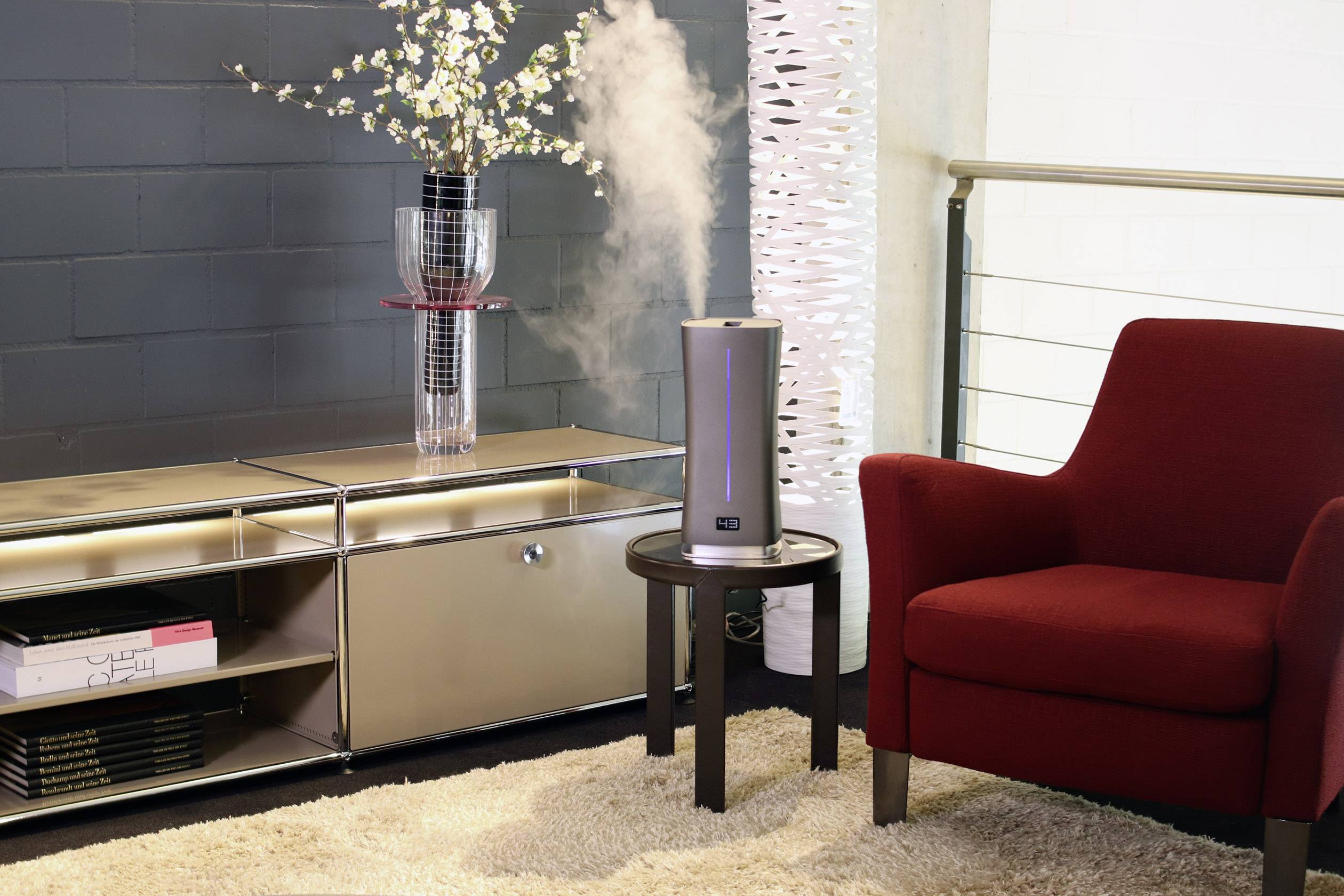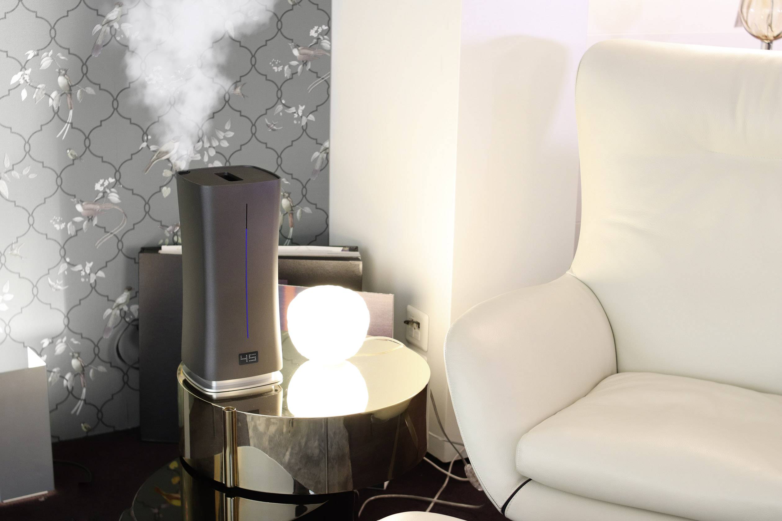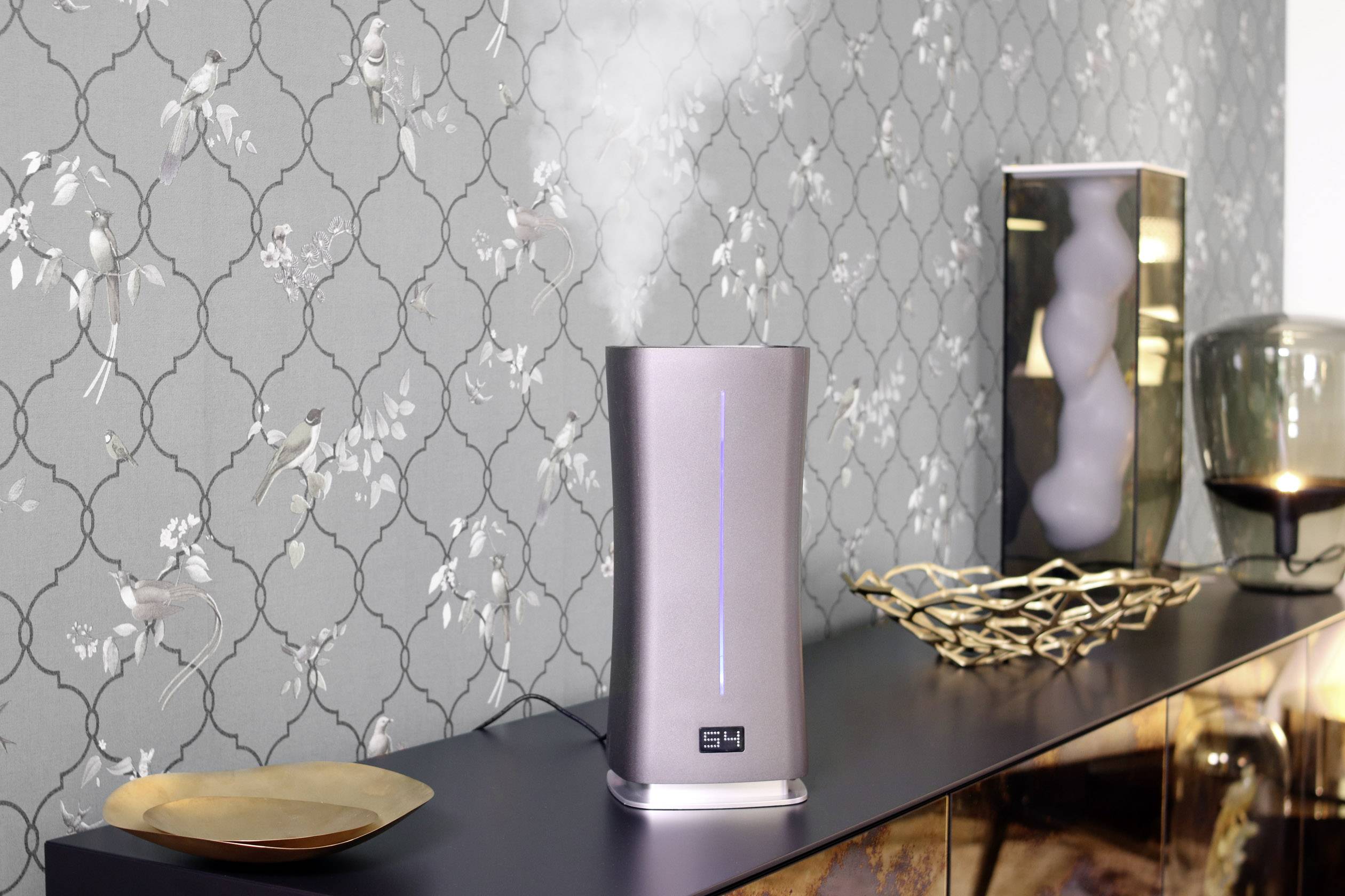 Digitale, ultrasone luchtbevochtiger Stadler Form Eva Little weet zelf wanneer de luchtvochtigheid in ruimtes tot 50 m² te laag is. Deze ultrasone luchtbevochtiger blaast naar wens koude of warme mist de ruimte in. Je stelt de gewenste luchtvochtigheid in tussen 30 - 75% en de bevochtiging verloopt vanzelf. Verkrijgbaar in de kleuren zwart, wit en titanium! StadlerForm Swiss design since 1998