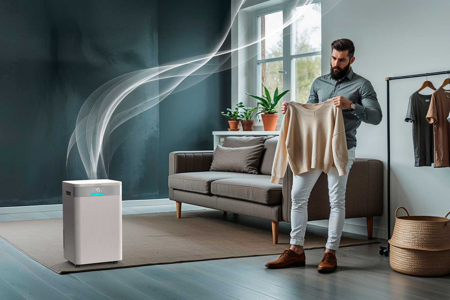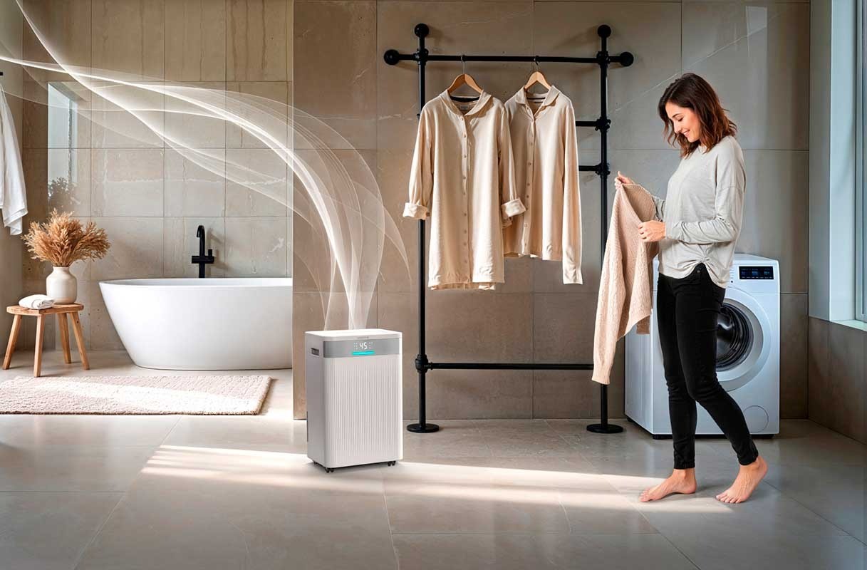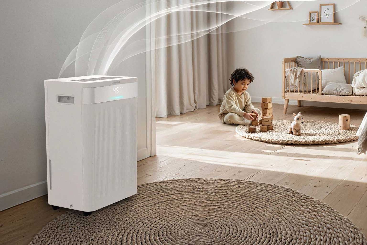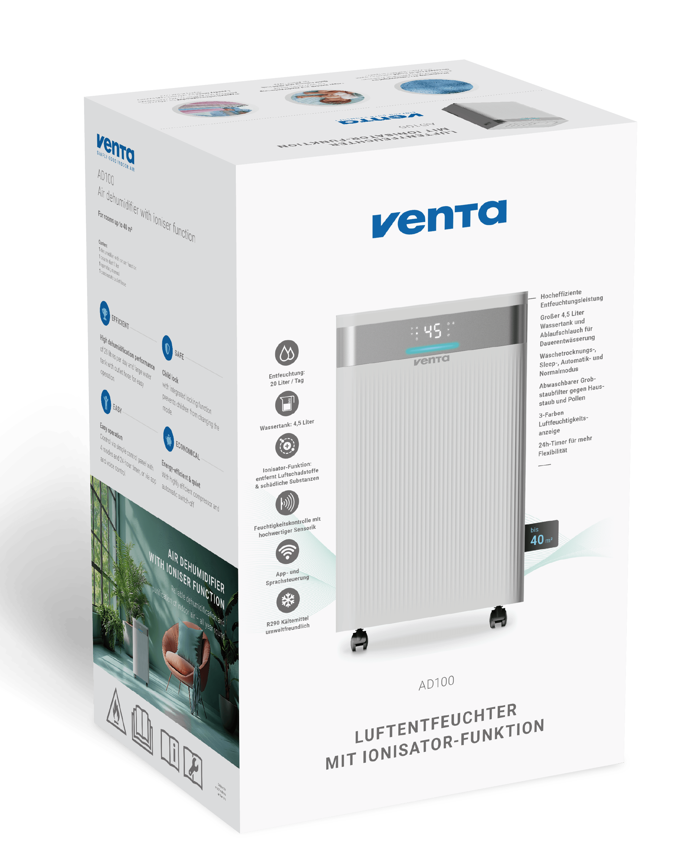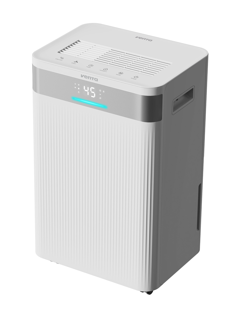 Vaarwel luchtvochtigheid, hallo gezond binnenklimaat! De Venta AD100 luchtontvochtiger met ionisator zorgt het hele jaar door voor frisse, gezonde lucht in ruimtes tot 100 m². Met een ontvochtigingscapaciteit tot 20 liter per dag verwijdert hij overtollig vocht en voorkomt zo schimmelvorming en condens op ramen. De geïntegreerde ionisator en het afwasbare grofstoffilter zuiveren de lucht van allergenen, geuren en schadelijke deeltjes, terwijl het apparaat stil, energiezuinig en effectief werkt. Dankzij app- en spraakbediening is de AD100 eenvoudig te bedienen en de vier slimme bedrijfsmodi, waaronder een efficiënte wasdroogfunctie, zorgen dag en nacht voor een optimaal binnenklimaat. Met kinderslot en milieuvriendelijk R290-koelmiddel is hij bovendien ontworpen voor de toekomst.