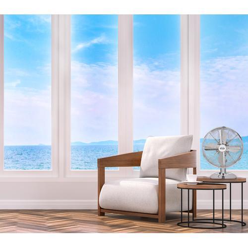 Wanneer elegantie en veelzijdigheid samengaan! Deze chromen Iridium bureau en tafel ventilator heeft een modieus ontwerp. Zijn beschermend rooster is gemaakt van verchroomd metaal, hij heeft een stoer retro design en geeft een hoog rendement. De Iridium is erg stil door de perfecte balancering van de bladen.