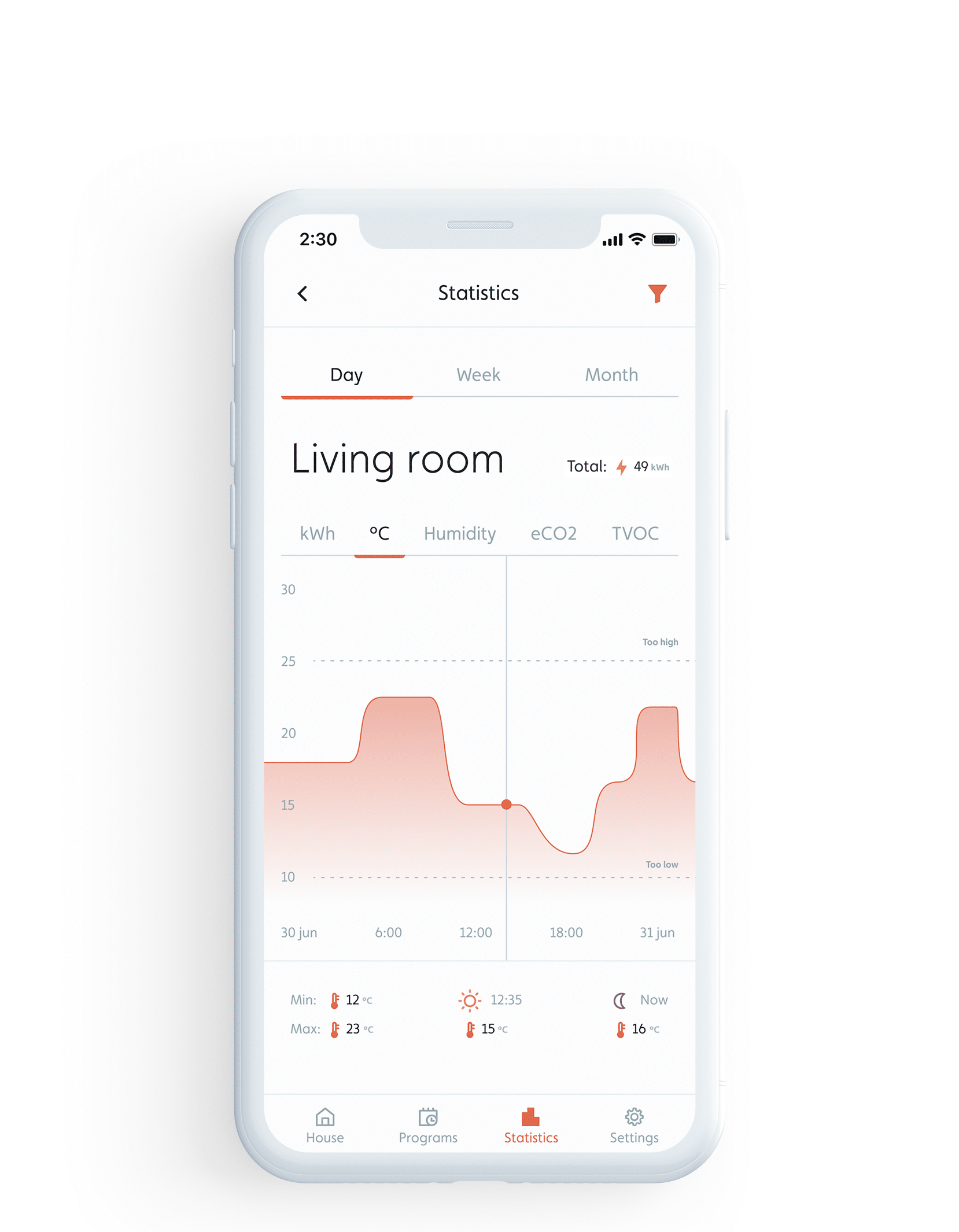 • Voorspellende verwarming - De kachel verwarmt de ruimte zodat de gewenste temperatuur op een bepaald tijdstip wordt bereikt. De paneelverwarming heeft een geavanceerd algoritme waarmee het leert hoe snel/langzaam de temperatuur in de kamer omhoog/omlaag gaat. Op die manier weet hij wanneer hij moet beginnen met verwarmen om de gewenste temperatuur te bereiken op het tijdstip dat je in de app hebt gepland